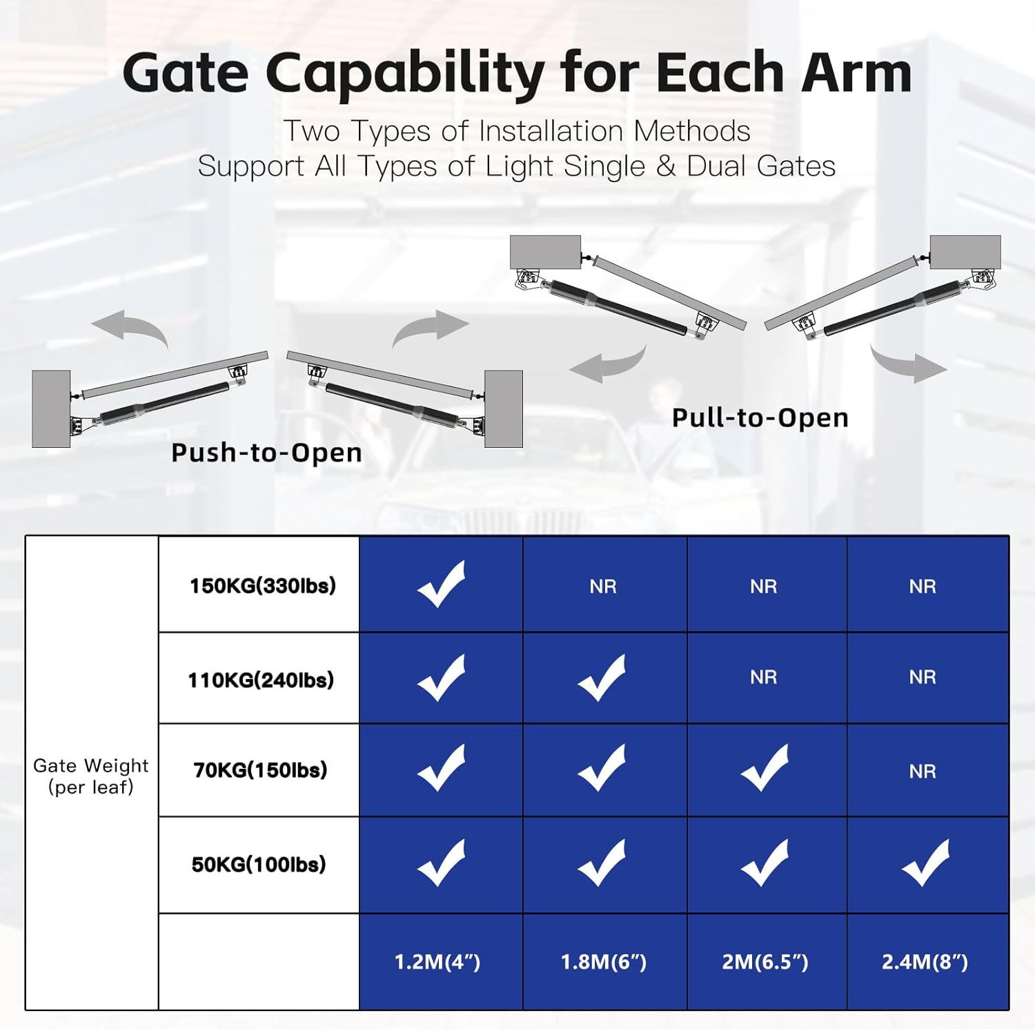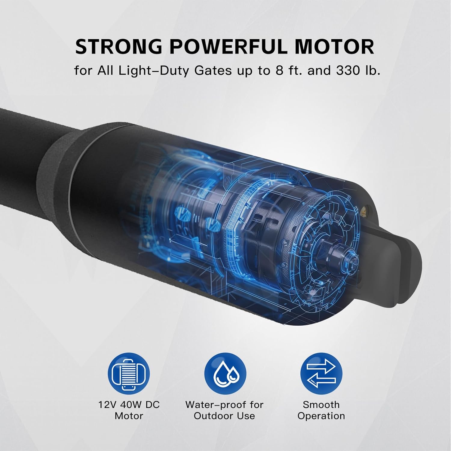 - 【Powerful Motor】X-XHOUSE's dual swing gate opener adopts a 12V 40W motor with higher power and efficiency, easily handle various types of light duty dual swing gates up to 330 LBS in weight or 8FT in length per leaf. High quality aluminum tube material suits for all tough environment and ideal for light duty gate application. It can be powered by a reliable solar system
