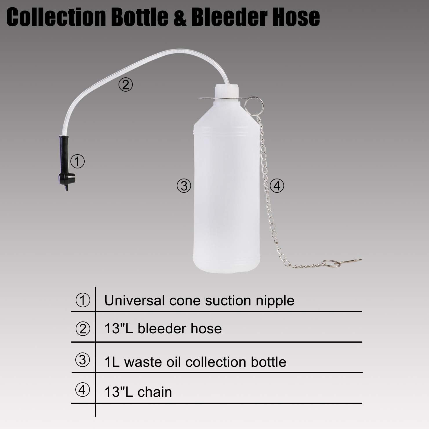 - Brake fluid bleeder kit includes a brake bleeder bottle, a case of master cylinder adapters and waste oil collection kit. They are made of aluminum alloy, brass, rubber and plastic. Resist corrision and built to last. Automotive pneumatic master cylinder bleeder kit includes 8 special adaptors, 2 universal cone adaptors and 1 universal square adaptor, all equipped with quick plugs for easy quick coupler connection and packaged in a black case to carry. Suit for almost all of master cylinders