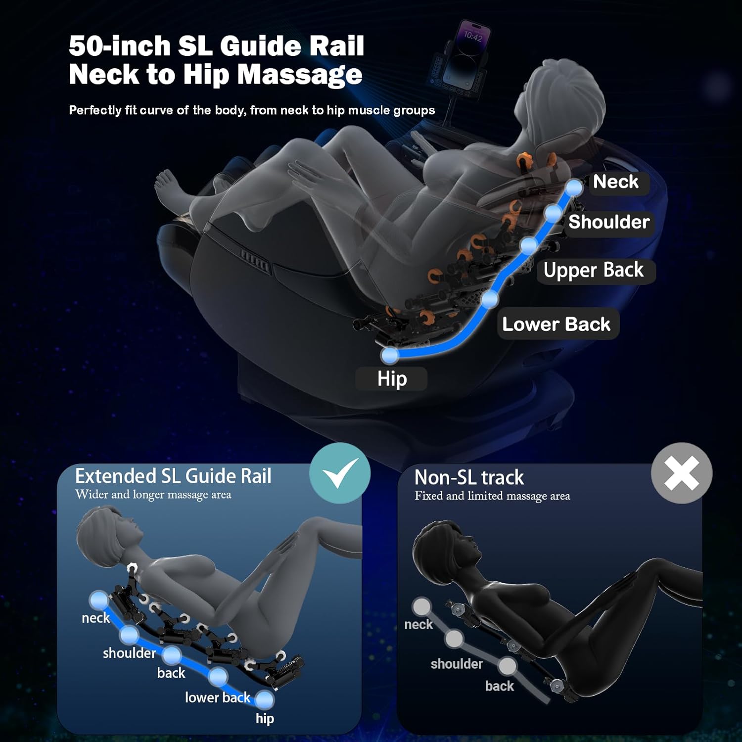 - 𝗭𝗲𝗿𝗼 𝗚𝗿𝗮𝘃𝗶𝘁𝘆 + 𝟳 𝗠𝗮𝘀𝘀𝗮𝗴𝗲 𝗧𝗲𝗰𝗵𝗻𝗶𝗾𝘂𝗲𝘀 - With a 50-inch SL track, this massage chair delivers 7 different massage techniques: airbag compression, shiatsu, tapping, tuina/scraping, kneading, percussion, and Thai stretching. It provides complete relaxation that stretches from your hips to your neck. The zero gravity mode also improves the quality of the massage in general. Our massage chair's adjustable recline adjustment feature accommodates a variety of user demands. It's possible that your wishes will be fulfilled, whether you wish to watch TV on the massage chair or take a little nap while getting a massage