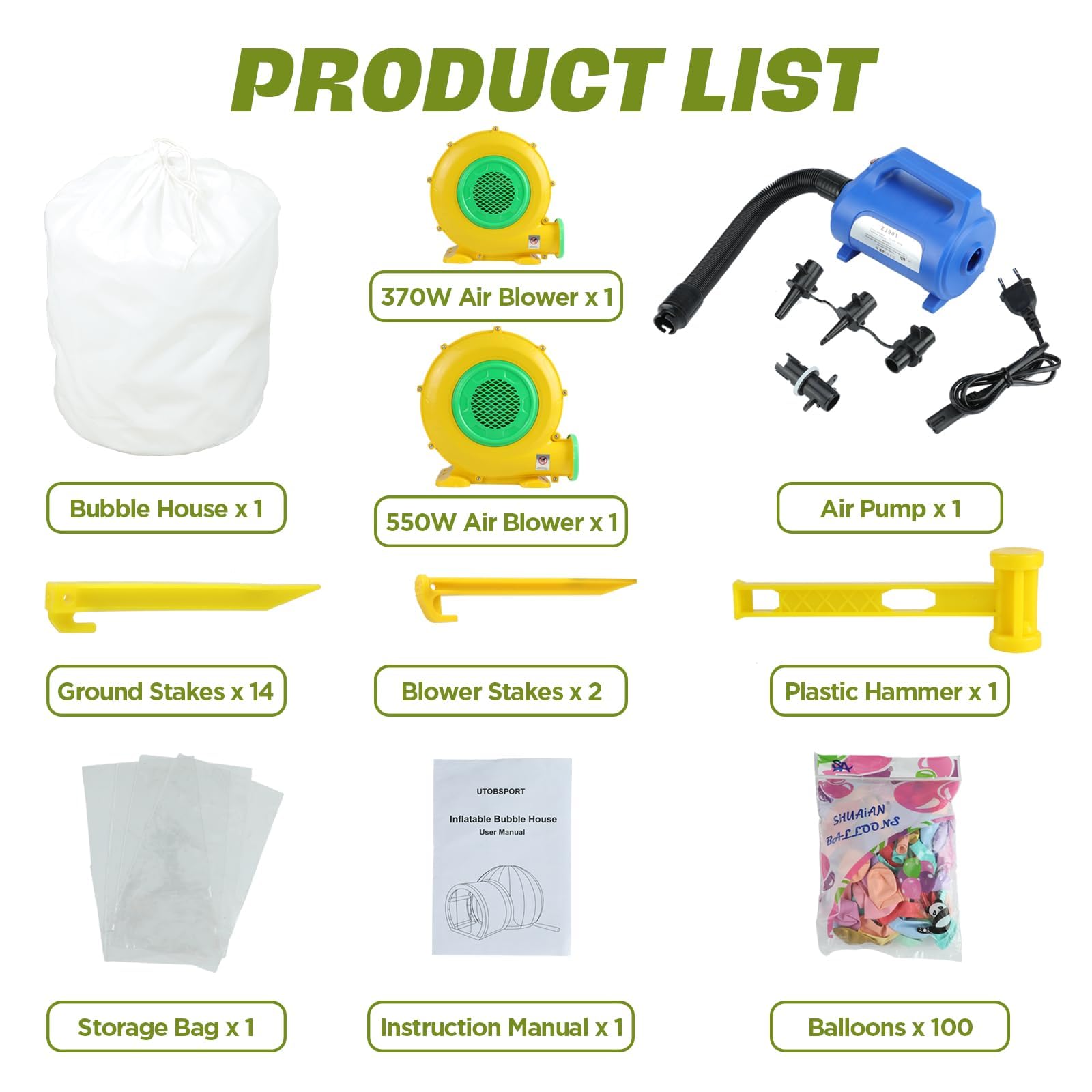 - ALL IN ONE SET: 10FT Bubble House x 1, 550W Air Blower x 1, 370W Air Blower x 1, Air Pump x 1, Ground Stakes x 21, Blower Stakes x 4, Plastic Hammer x 1, Repair Kit x 1, Storage Bag x 1, Instruction Manual x 1, Balloons x 100.