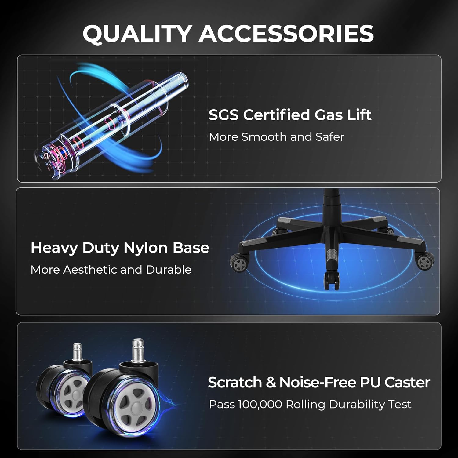 - Sturdiness Assured -- We upgraded the configuration of this PC gaming chair. The rubber casters roll silently and have passed a 1000-mile rolling test. BIFMA certified heavy duty base, class 3 gas cylinder by SGS certified, it is durable and long-lasting.