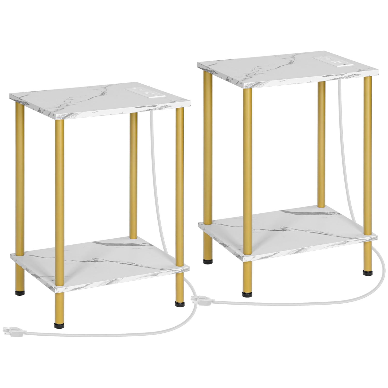- Side Table with Charging Station: Phone out of power at night? Inconvenient to turn on the light? Then this set of 2 2-tier side tables comes to help you out! With 4.9 feet long power cord, one 3-prong AC outlet and 2 USB ports, this side table offers you enough charging space for your electronic devices. Moreover, the simultaneous charging of your phone, tablet, desk lamp or laptop shall be a reality, no need for extra power strips