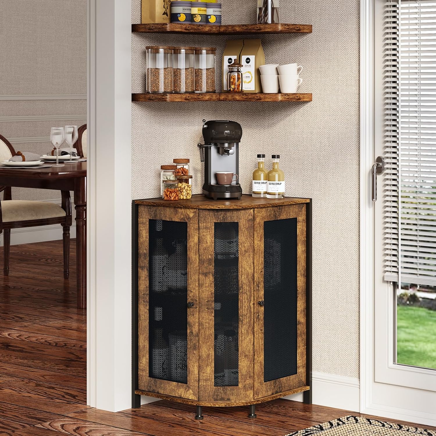 keomaisyto Coffee Bar Cabinet, 3-Tier Corner Coffee Cabinet with Storage Shelf & 18.7" Countertop, Rustic Wood Corner Bar Station with Magnetic Door for Kitchen/Entrance/Living Room/Dining Room
