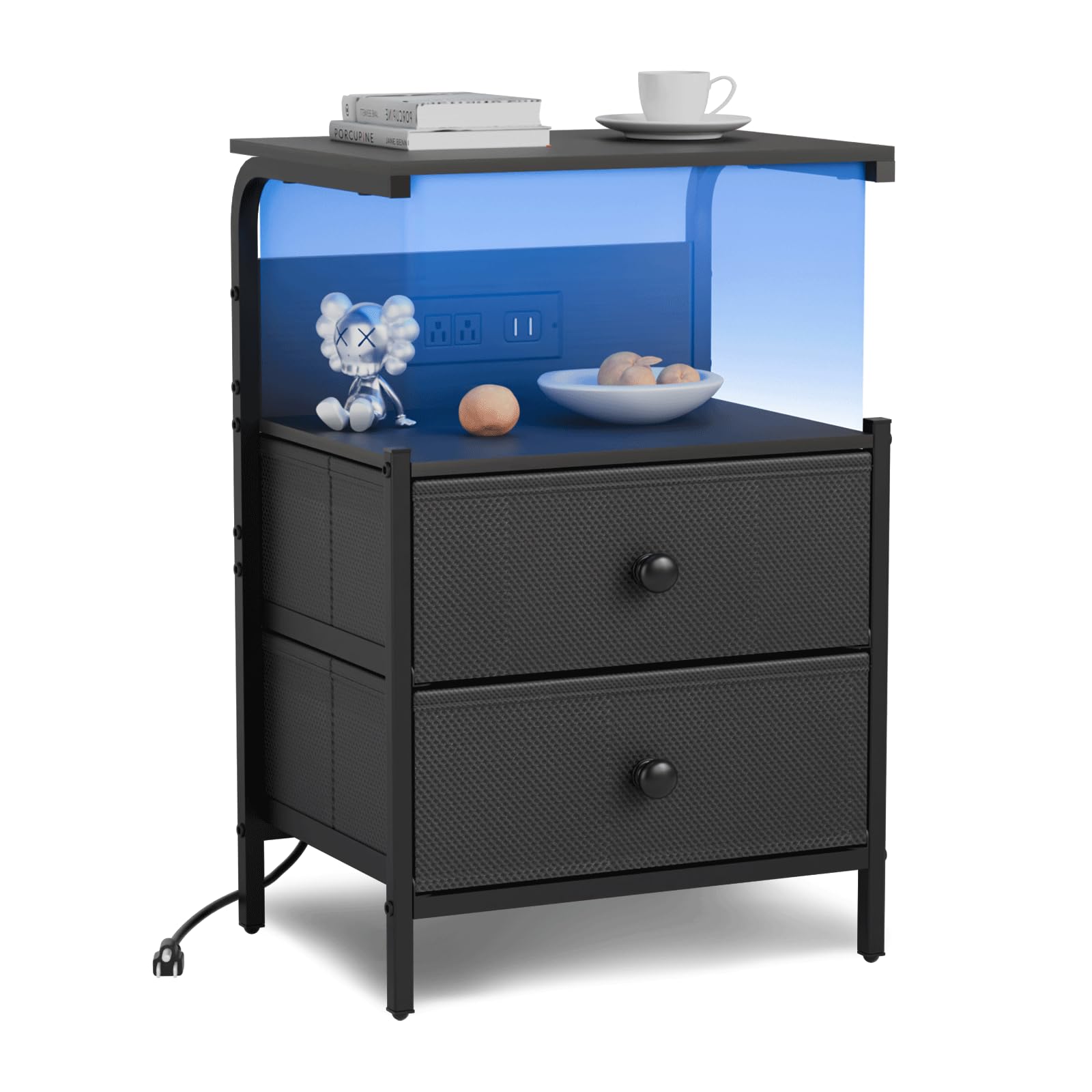 Nightstand with Charging Station and LED Lights, Side Table with 2 Fabric Drawers, Bedroom Nightstand, 3 Tier Storage Coffee Table, Living Room (1, White)