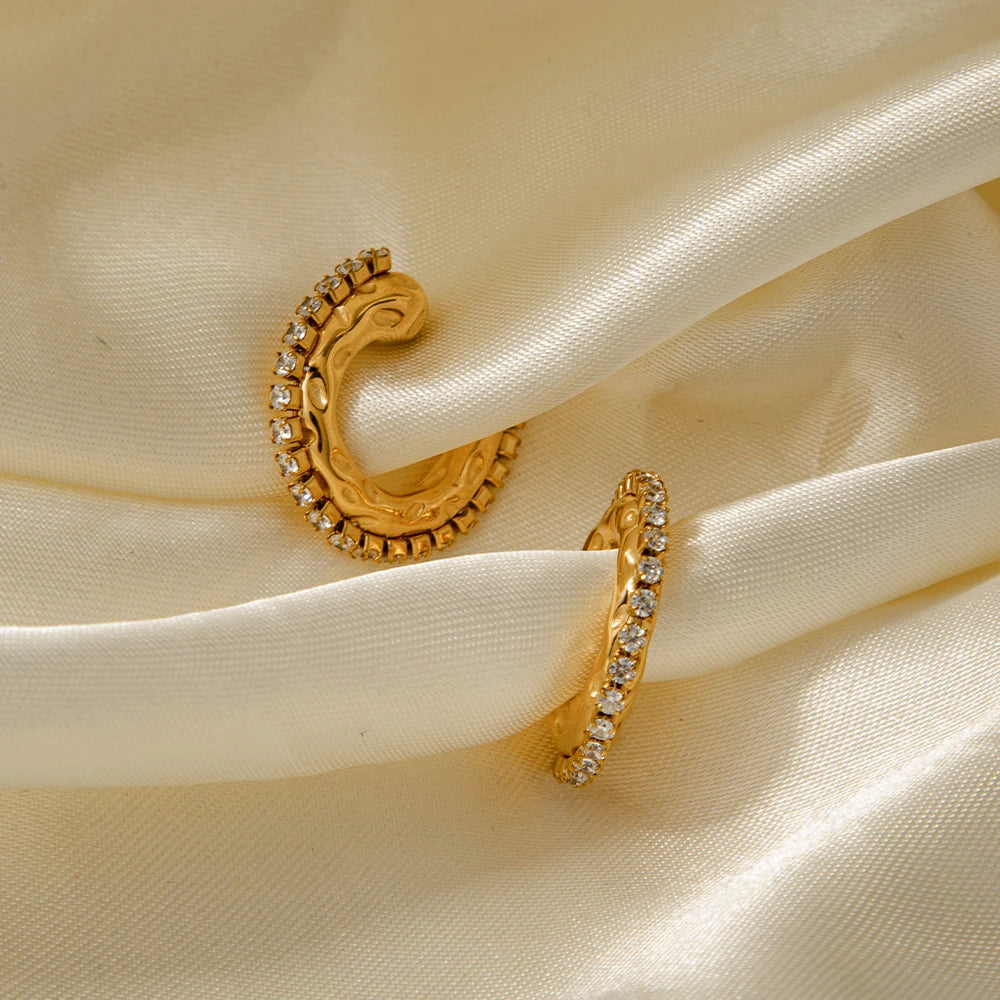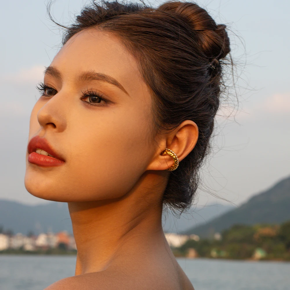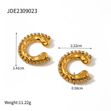 Acero inoxidable chapado en oro de 18K martillo en forma de C con incrustación de grano y clip de sujeción con taladro de circonita a prueba de deslustre joyería ligera de lujo para mujer