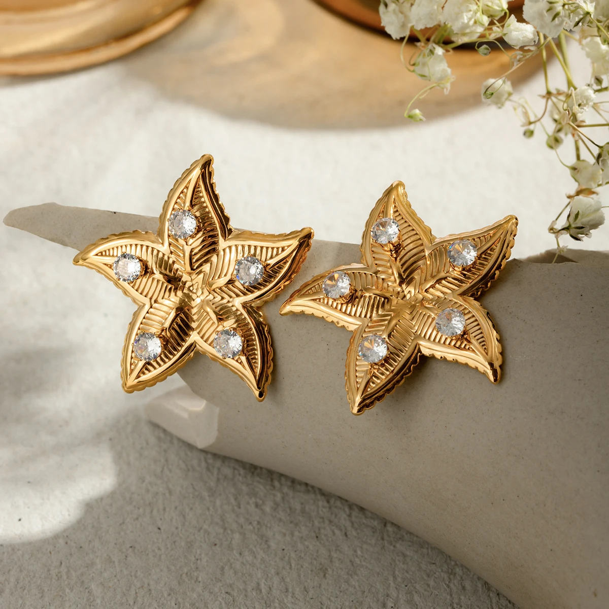 Aretes en forma de estrella de mar chapados en oro de 18K y acero inoxidable con circonio incrustado – Joyería vintage llamativa para mujeres 🌟