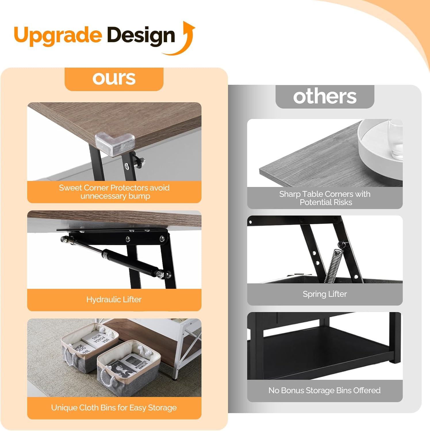 - Space Efficiency: One hidden compartment with a depth of 5", two high-quality cloth storage bins for more storage. Tabletop instantly converts into a dining table for a movie day night or a home workstation