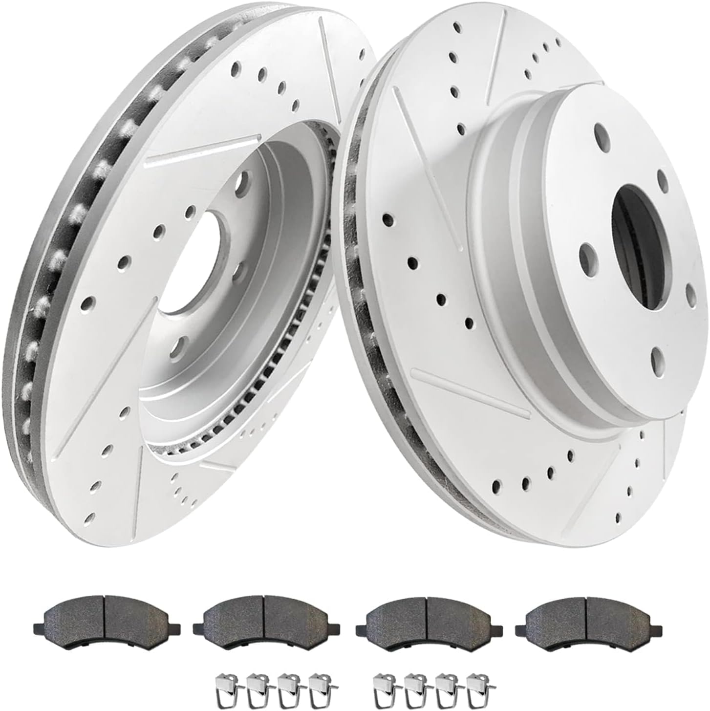 - Kit Includes: 2x Front & Rear Drilled & Slotted Disc Brake Rotors, 2x Front & Rear Brake Pads (Hardware Included).