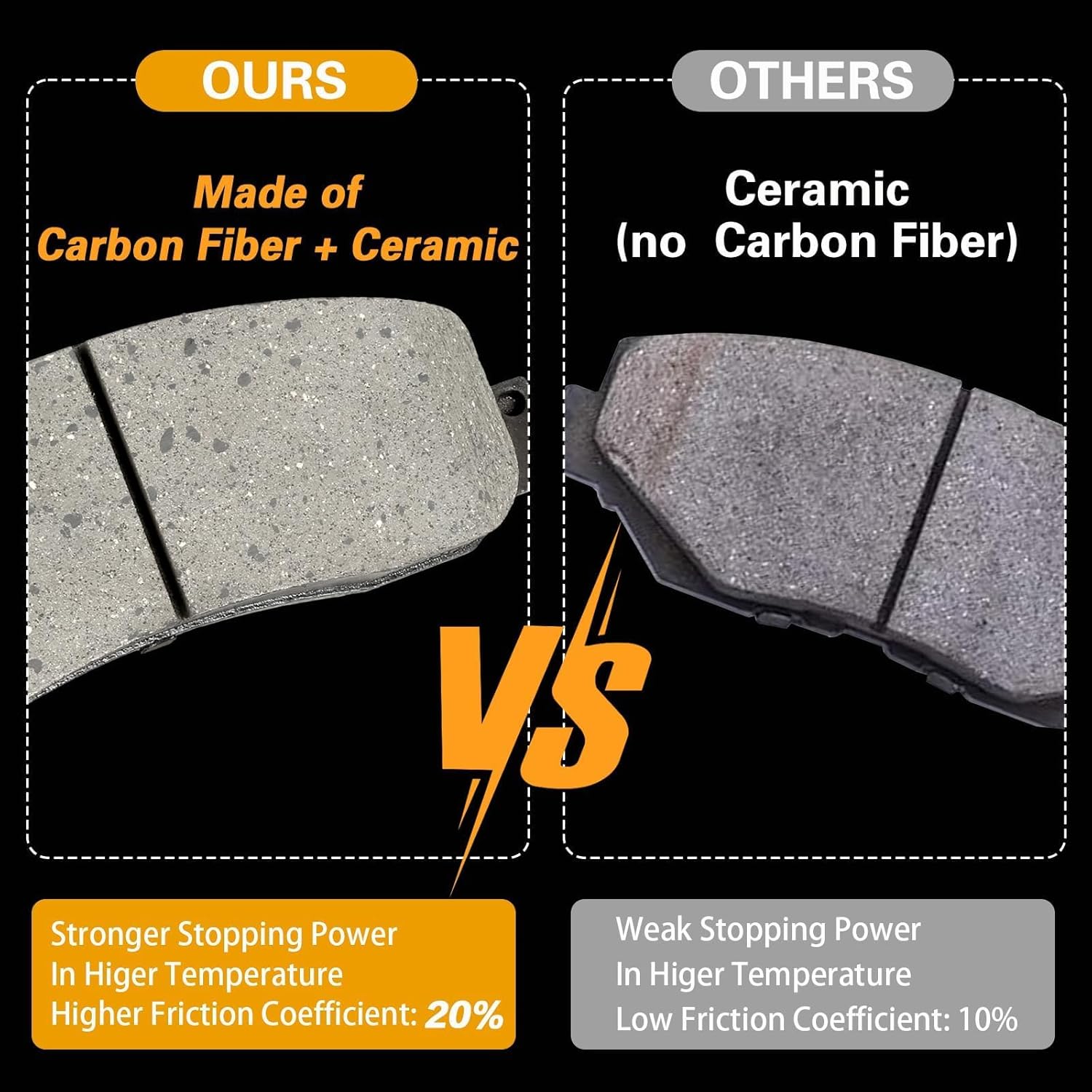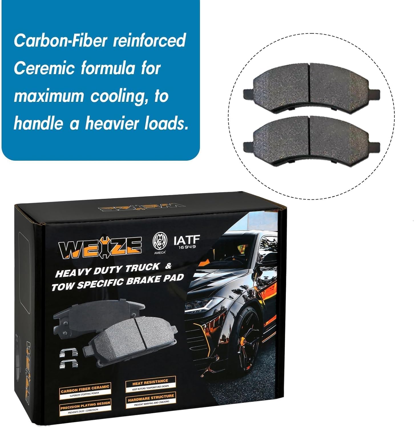 - Carbon Fiber Brake Pads: design for Truck and Tow, Carbon Fiber ceramic materials enhance a heavier loads vs. traditional ceramic brake pads.