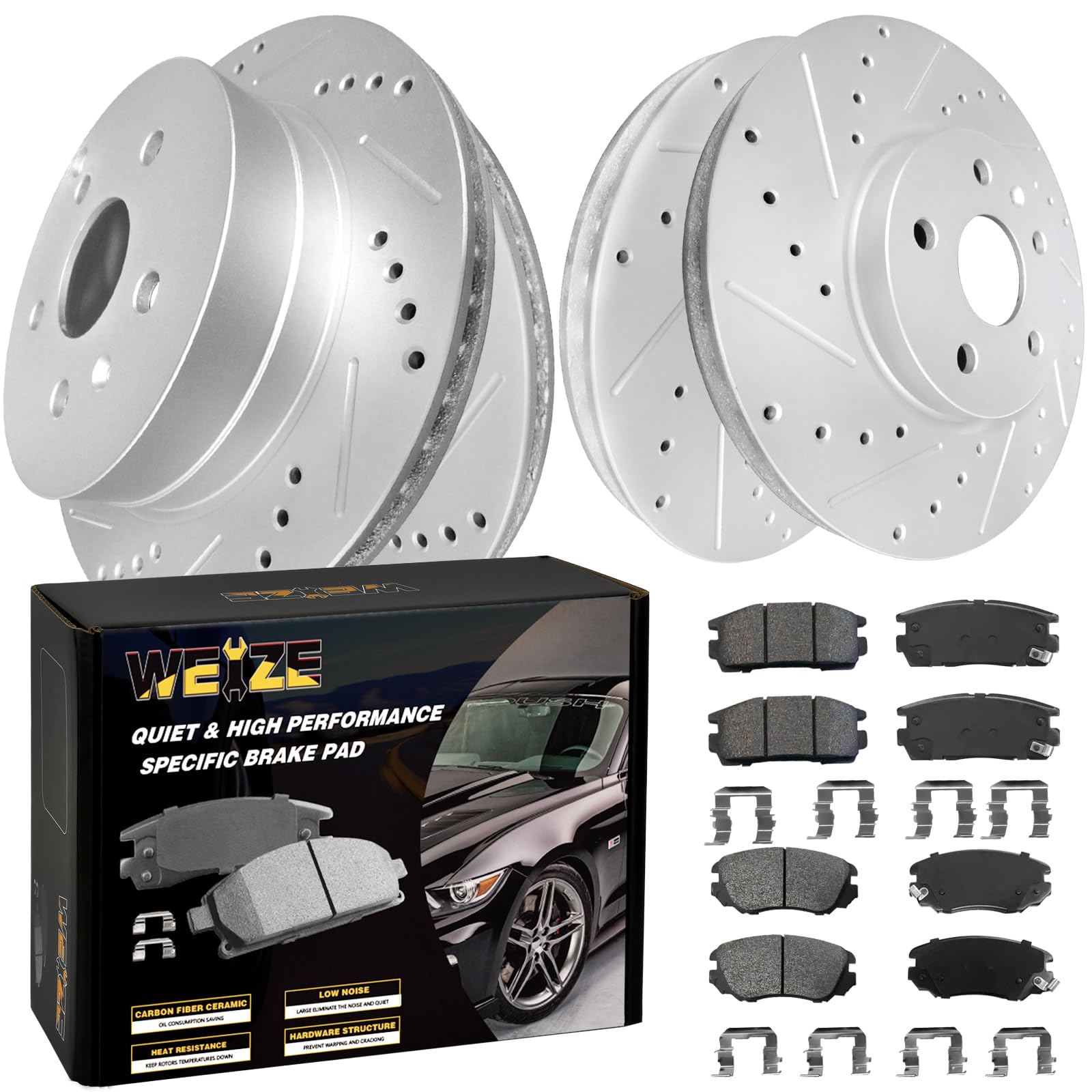 WEIZE Front +Rear Truck & Tow Brake Kit, Carbon Fiber Ceramic Brake Pads & Drilled/Slotted Brake Rotors, Fit for Dodge Ram 1500 & Classic Durango Chrysler Aspen, 5 Lug