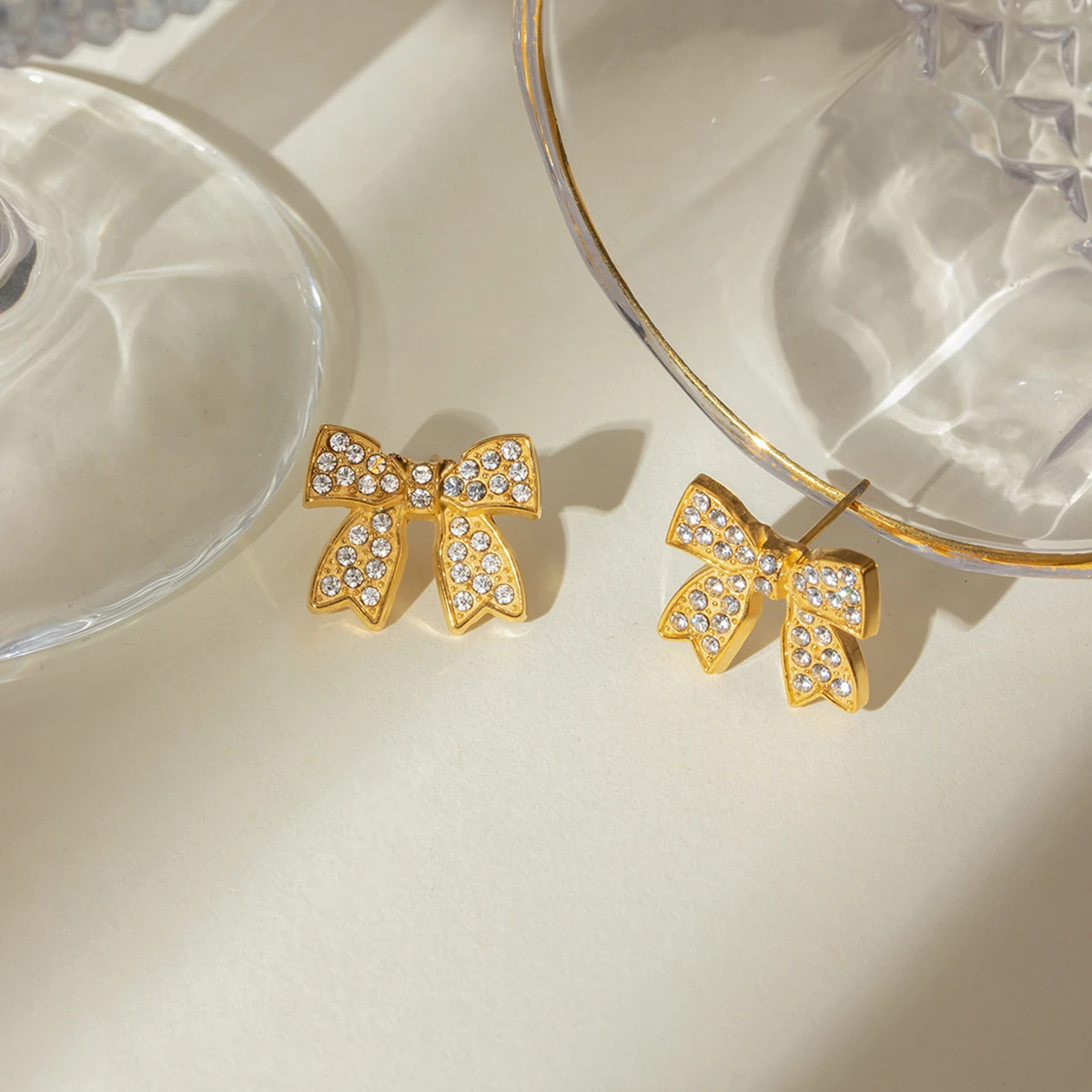 18K PVD Minimalist Stainless Steel Bowknot Rhinestone Earring & Ring Set - Trendy Jewelry for Women