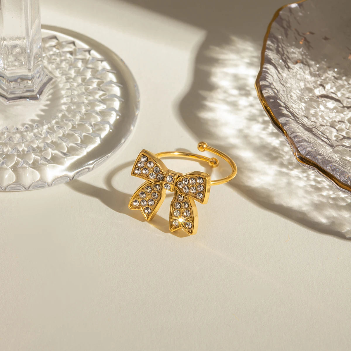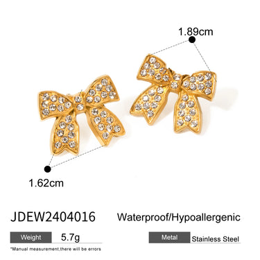 18K PVD Minimalist Light Cozy Stainless Steel Bowknot Rhinestone Open Ring Earring Set Trendy Women Waterproof Bijoux Jewelry