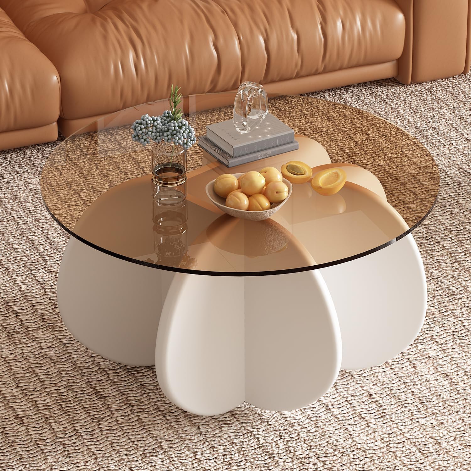 Glass Coffee Table, Mid Century Modern Design, 31.5'' Modern Round Tempered Glass Coffee Tables for Living Room, Cocktail Table for Small Space Home Office. (White + Brown)