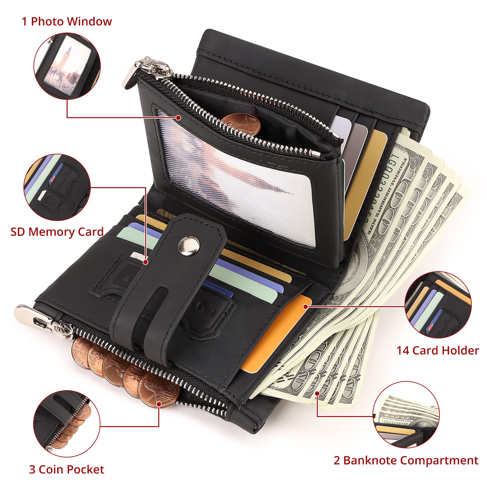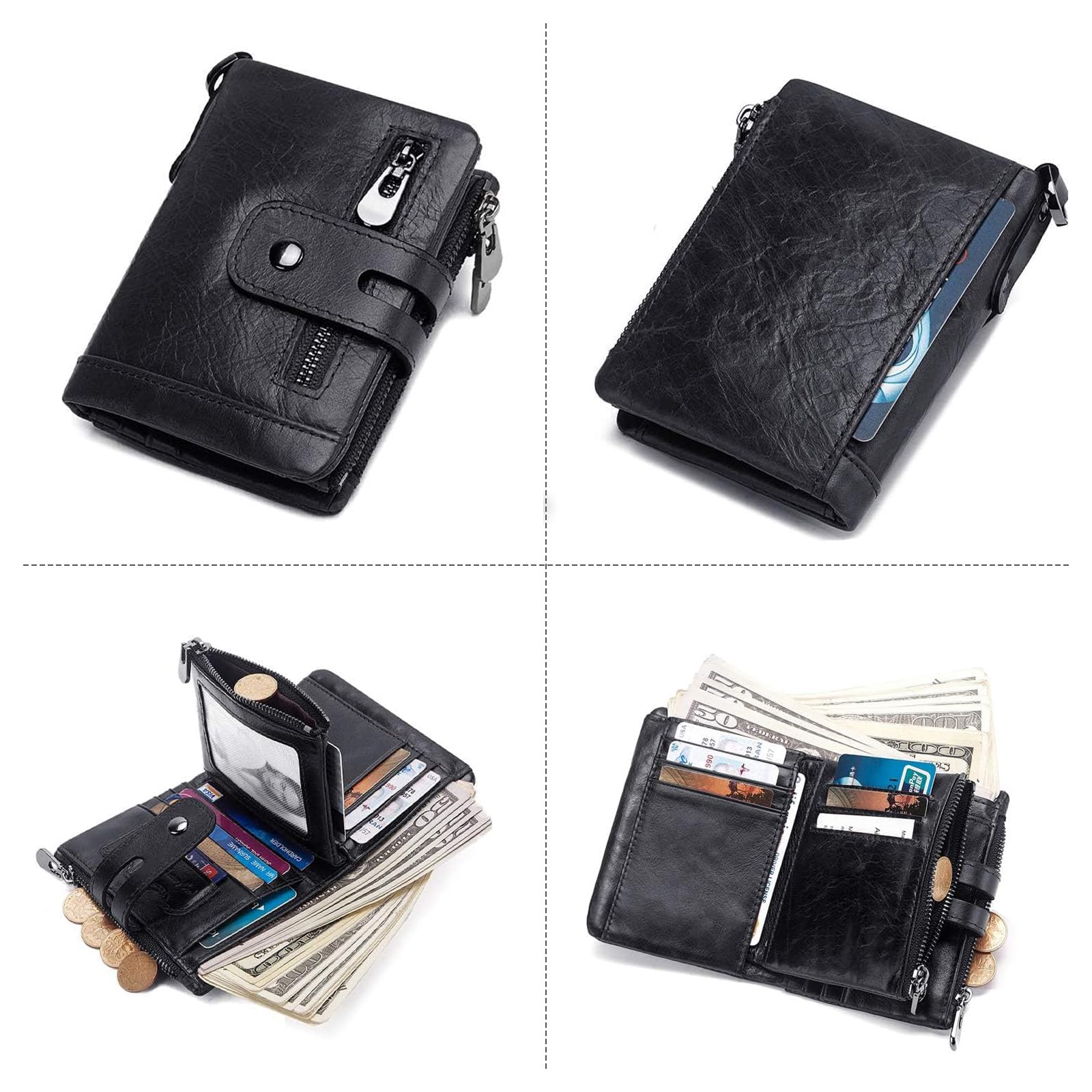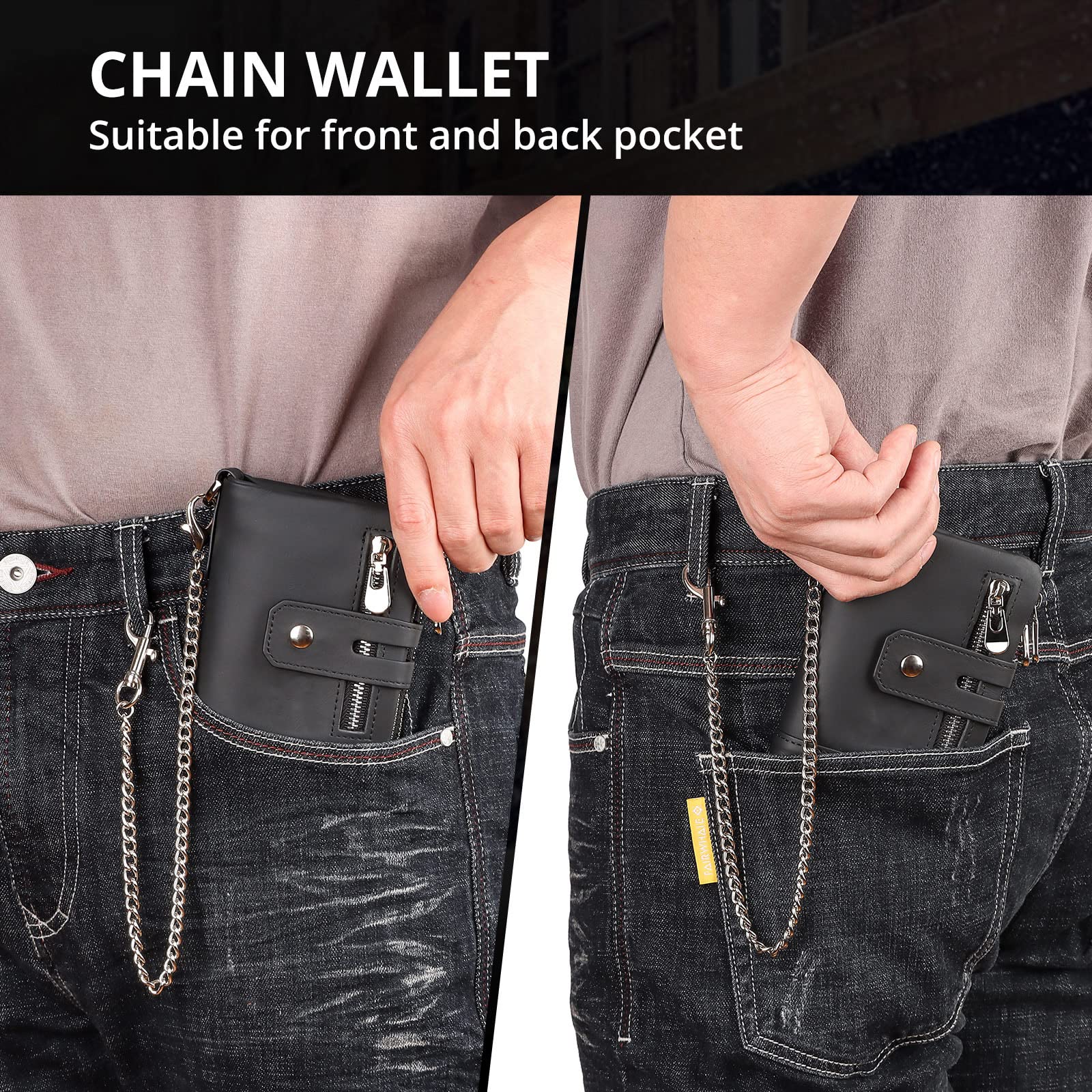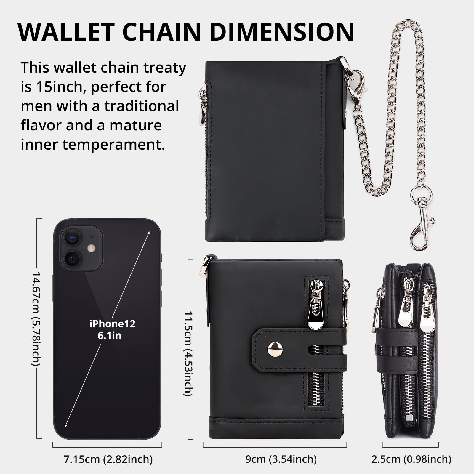 کیف پول مردانه gzcz با زنجیر، ضد سرقت RFID، چرم اصل، دو لت، کیف پول مردانه با پنجره کارت شناسایی و جیب زیپ سکه، مشکی