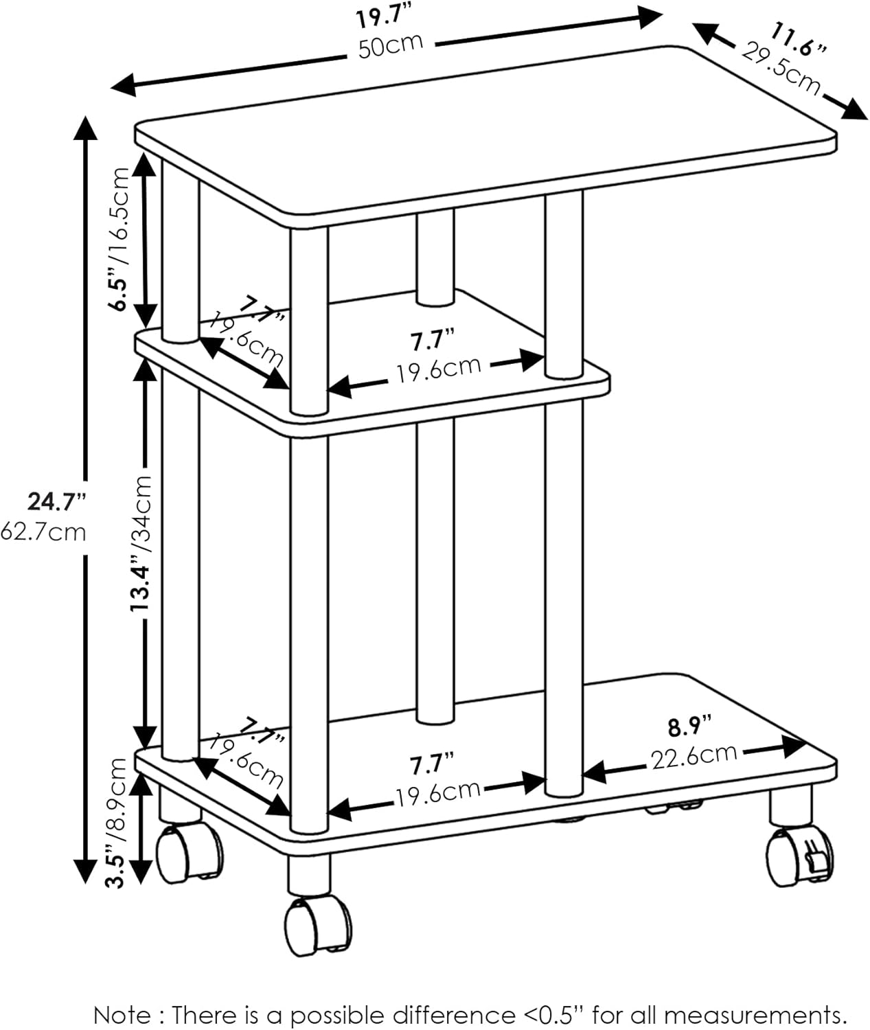 Furinno Turn-N-Tube C Shape Sofa Side Table with Casters is designed with simple yet stylish appearance that fit in any room settings as it comes with two color options: Espresso/Black and French Oak Grey/Black. We focus on products that fit in your space and fit on your budget. This side table comes with caster that enhance its functionality as it increases the mobility of the furniture. Not only that, this side table has open display racks and shelves that provide ample storage space for decorative and home living accessories. One of the best part of this furniture is that it can be assembled without any tools; carefully follow the steps provided in instructions is important to avoid difficulties. Assembly can be done within 10-15 minutes by simply twisting and turning the poles against the board and tighten them. It allows you to experience the fun of D-I-Y with your friends and family. Care instruction: wipe clean with mild cleanser using soft damped cloh and avoid using harsd cleanser on the furniture to avoid damage. All pictures are for illustration purposes only; decor items are not included in this offer.