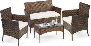 مجموعه مبلمان پاسیو Sweetcrispy شامل ۴ قطعه، مبلمان فضای باز با کوسن نرم و میز شیشهای، صندلیهای حصیری بافت دستی مقاوم در برابر همه شرایط آب و هوایی برای باغ، تراس، ایوان، چمن (قهوهای و بژ)