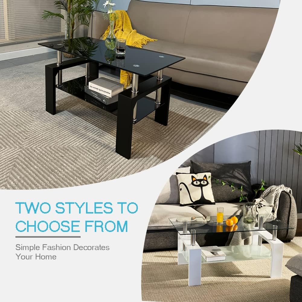 Table basse rectangulaire Btrpily pour salon, table à thé adaptée pour salle d'attente, table d'appoint moderne avec pied en bois, plateau en verre avec étagère inférieure, 39.5D x 23.5W x 17.5H pouces, noir