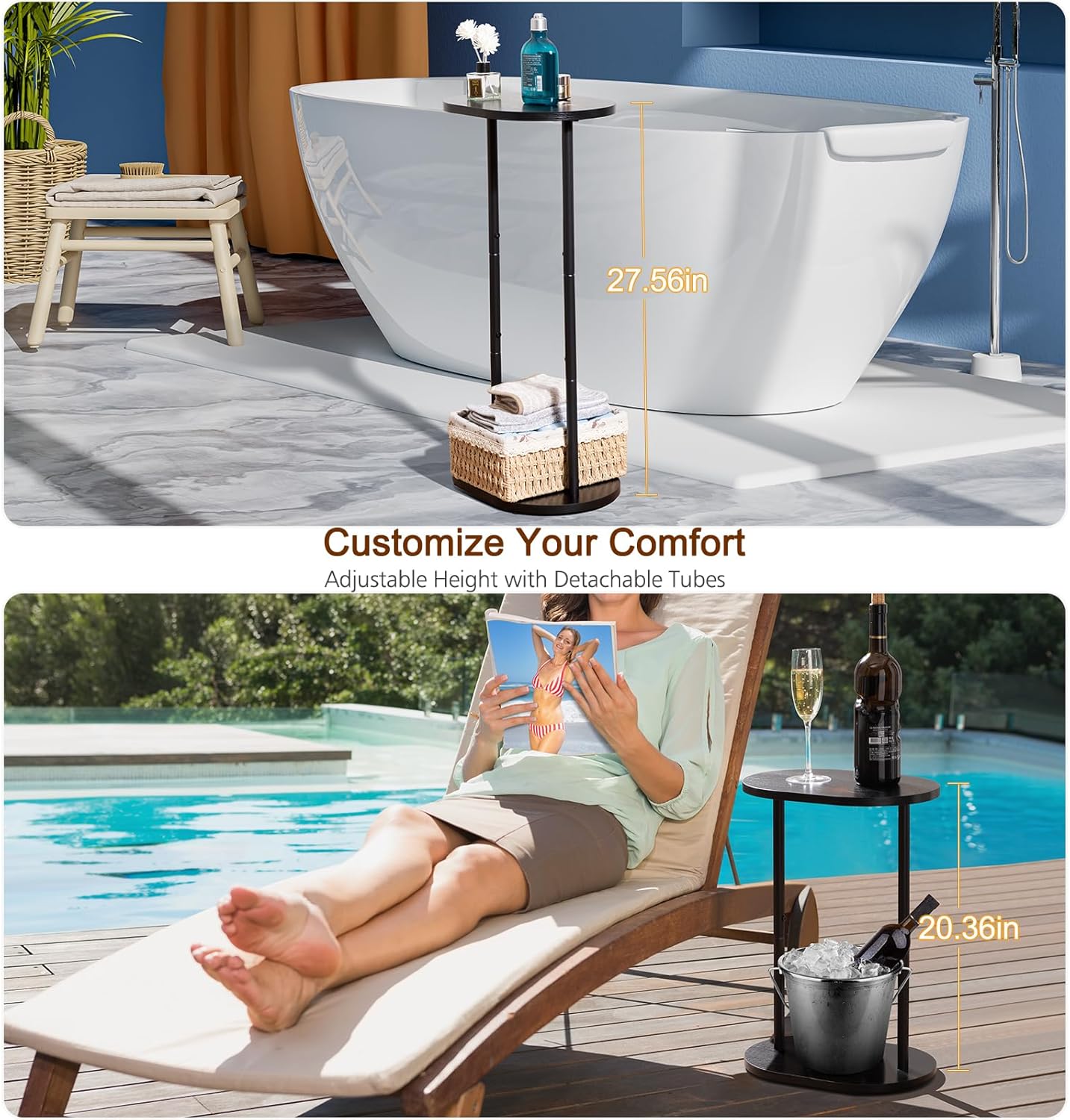 - Hauteur réglable, ajustement parfait partout : Personnalisez votre confort avec deux options de hauteur (21,54" et 28,74") ! Réglage bas ? Idéal pour les transats de piscine ou fauteuils bas pour garder les boissons à portée de main. Réglage haut ? Parfait avec canapés, lits ou baignoires comme table à boire haute. Fini les penchés gênants — votre dos vous remerciera