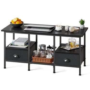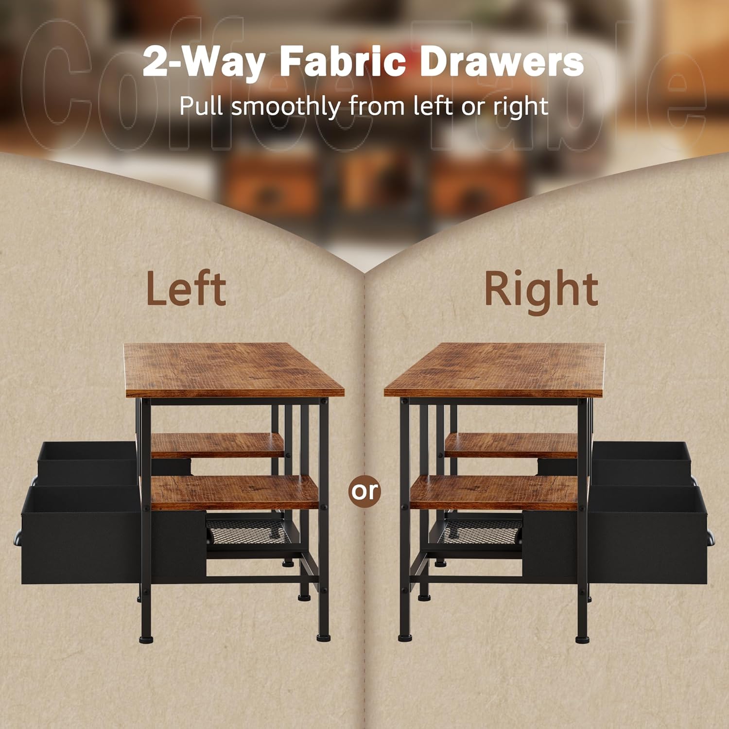 - [Spacious Storage Space] 35in coffee table features 2 fabric drawers which hold snacks and books, enlarge your space and keep all your things and organized. The innovative dual-access design lets you open drawers from either side. 3 open storage shelf beneath the coffee table top is designed to store your items like magazines, laptop, toy, etc.