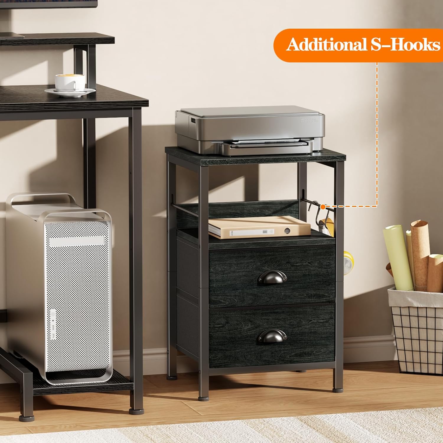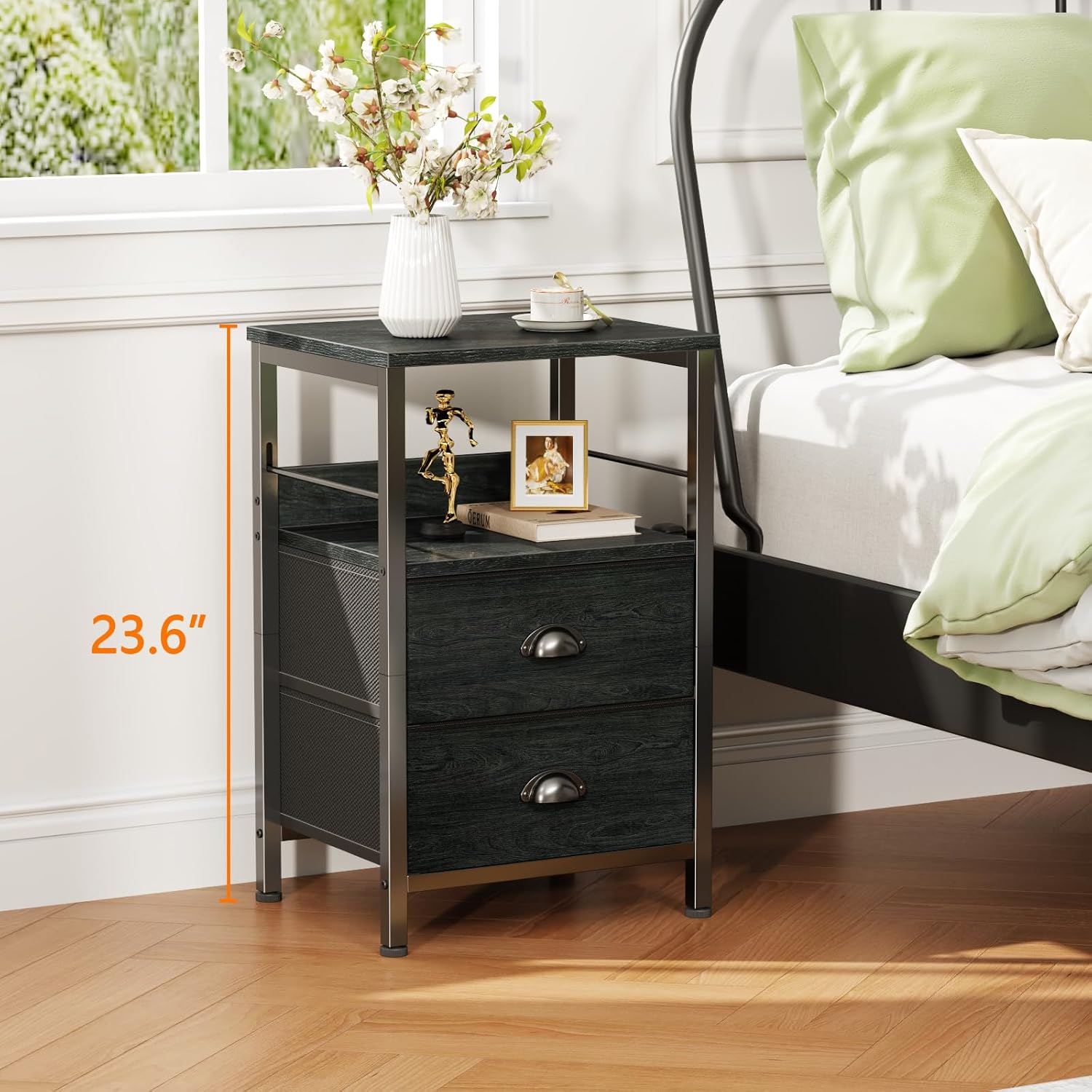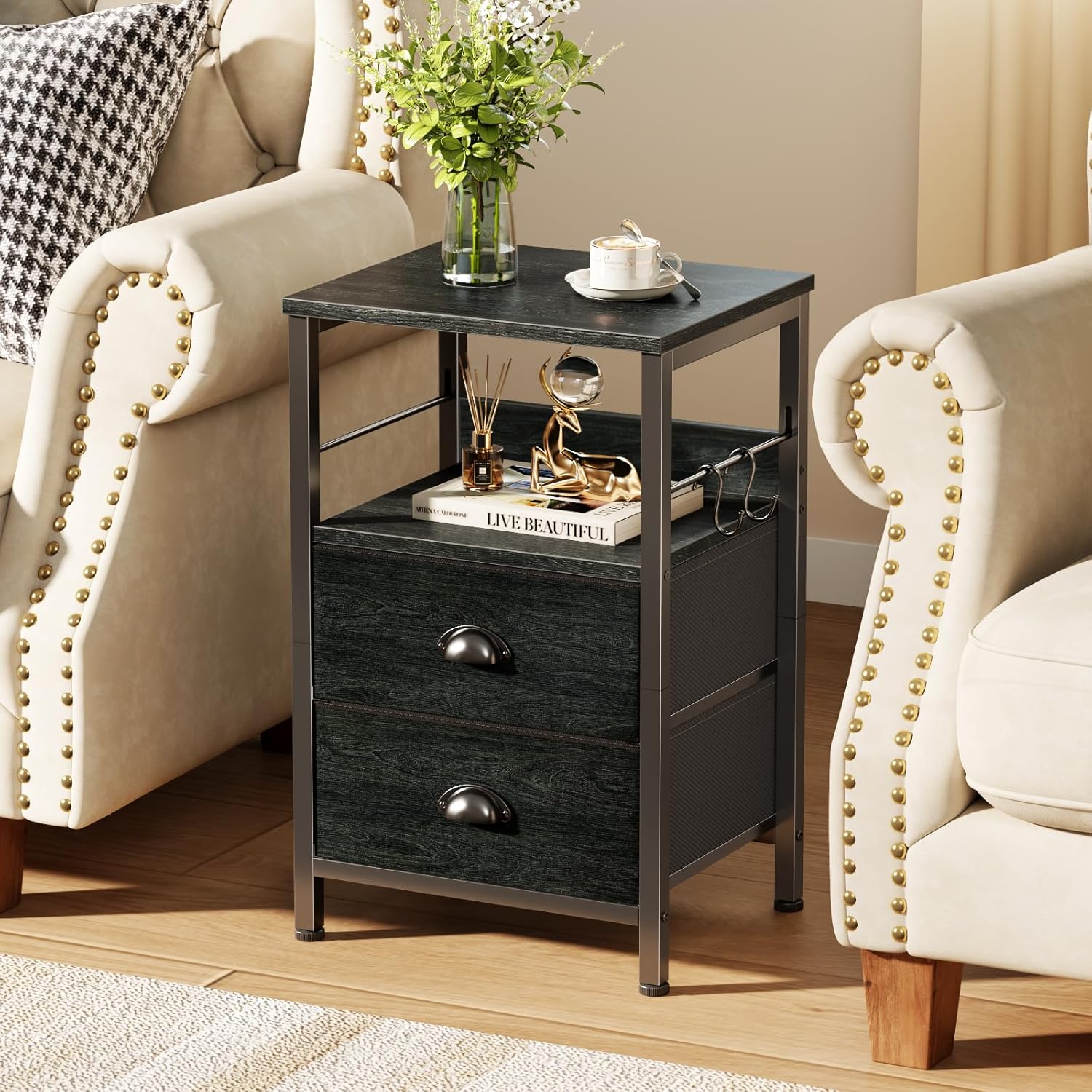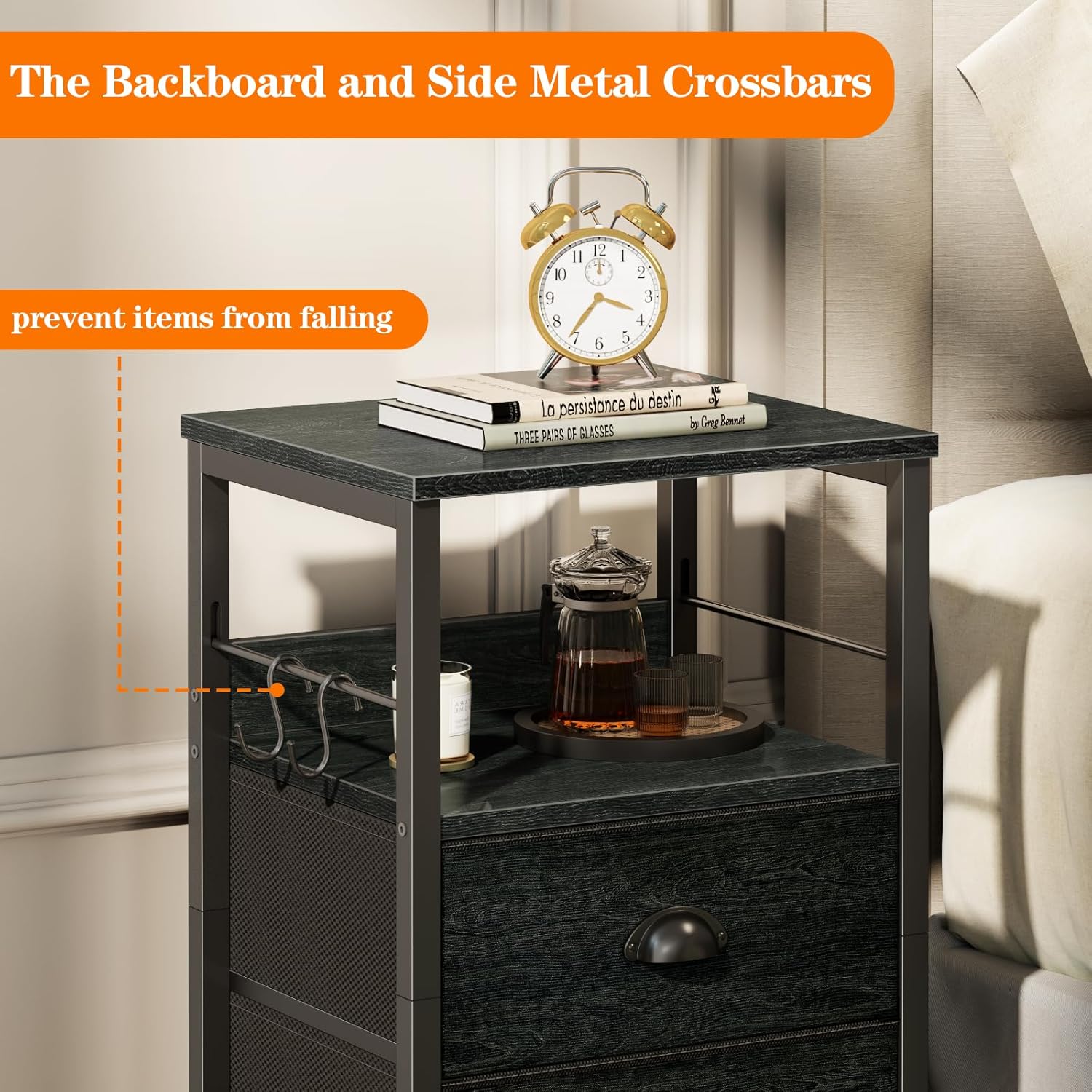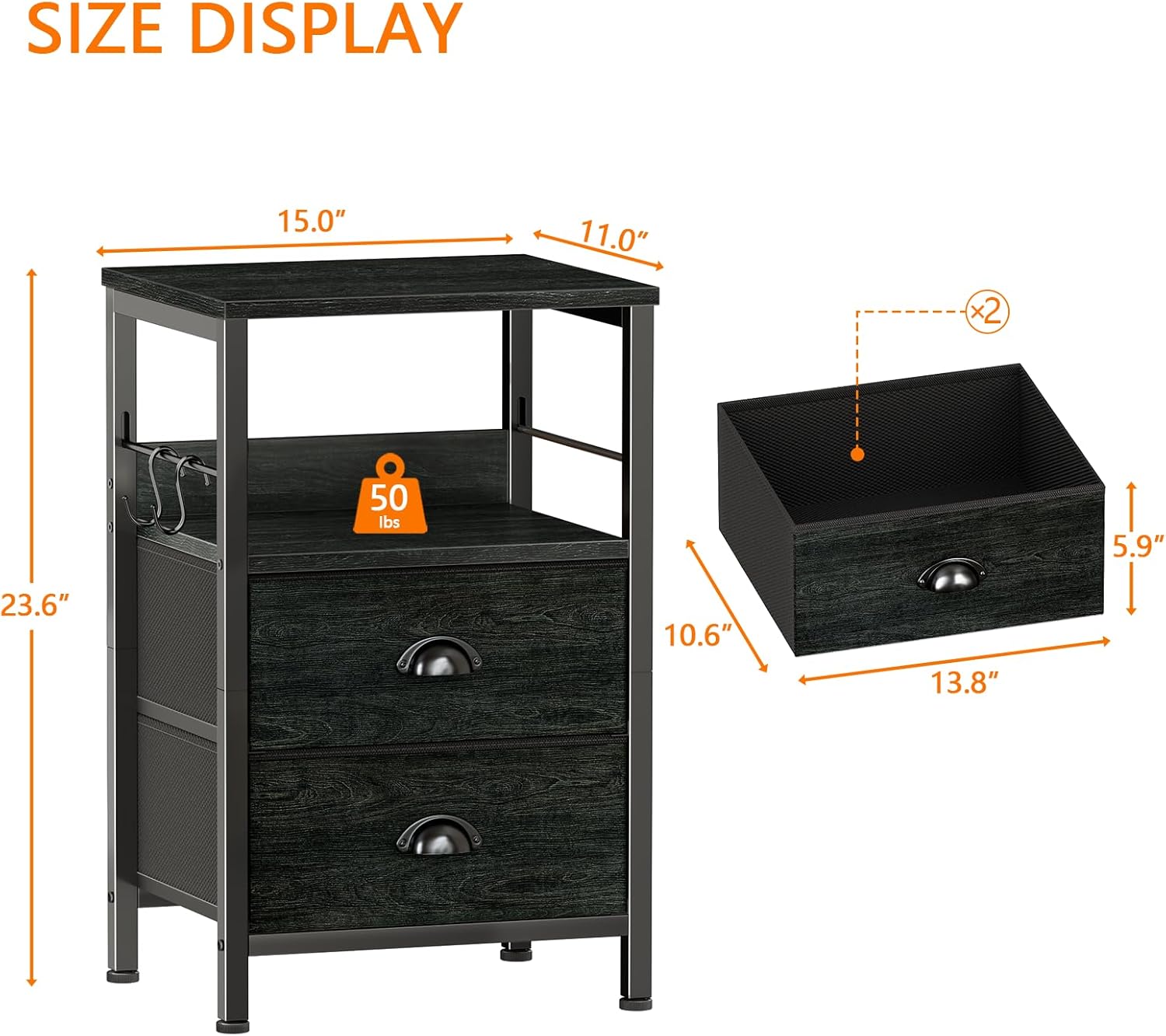 Furologee Nightstands Set 2, Night Stand with 2 Fabric Drawers, Bedside Tables with Open Shelf, Wooden Top, Hooks, Backboard Design, Metal Frame, End Tables for Bedroom/Living Room/Study/Black Oak
