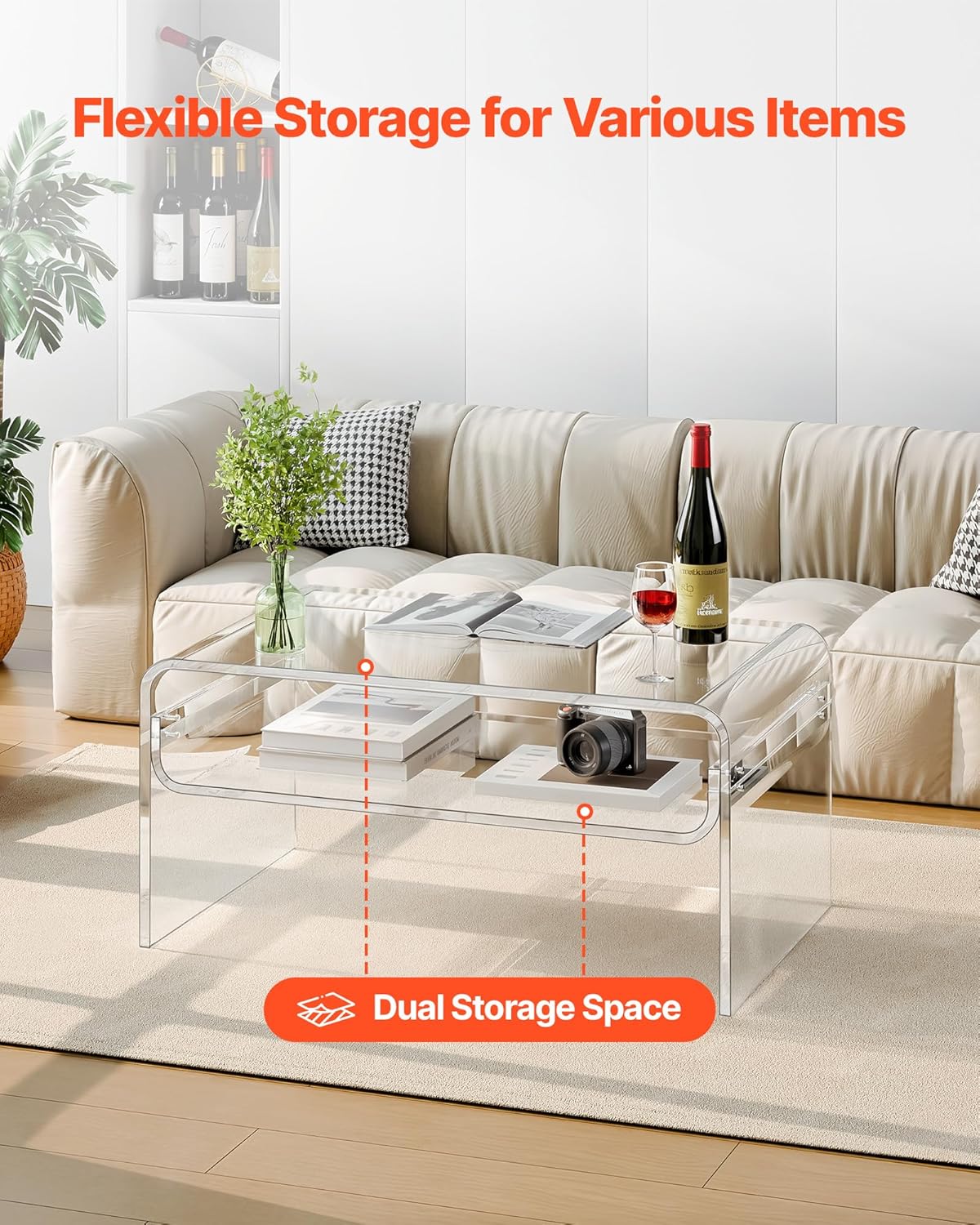 - Dual Storage Space: This acrylic coffee table features spacious 2-tier storage for laptops, books, documents, and décor. The transparent tabletop offers an unobstructed view, making it easy to find what you need—ideal as a coffee table or computer desk