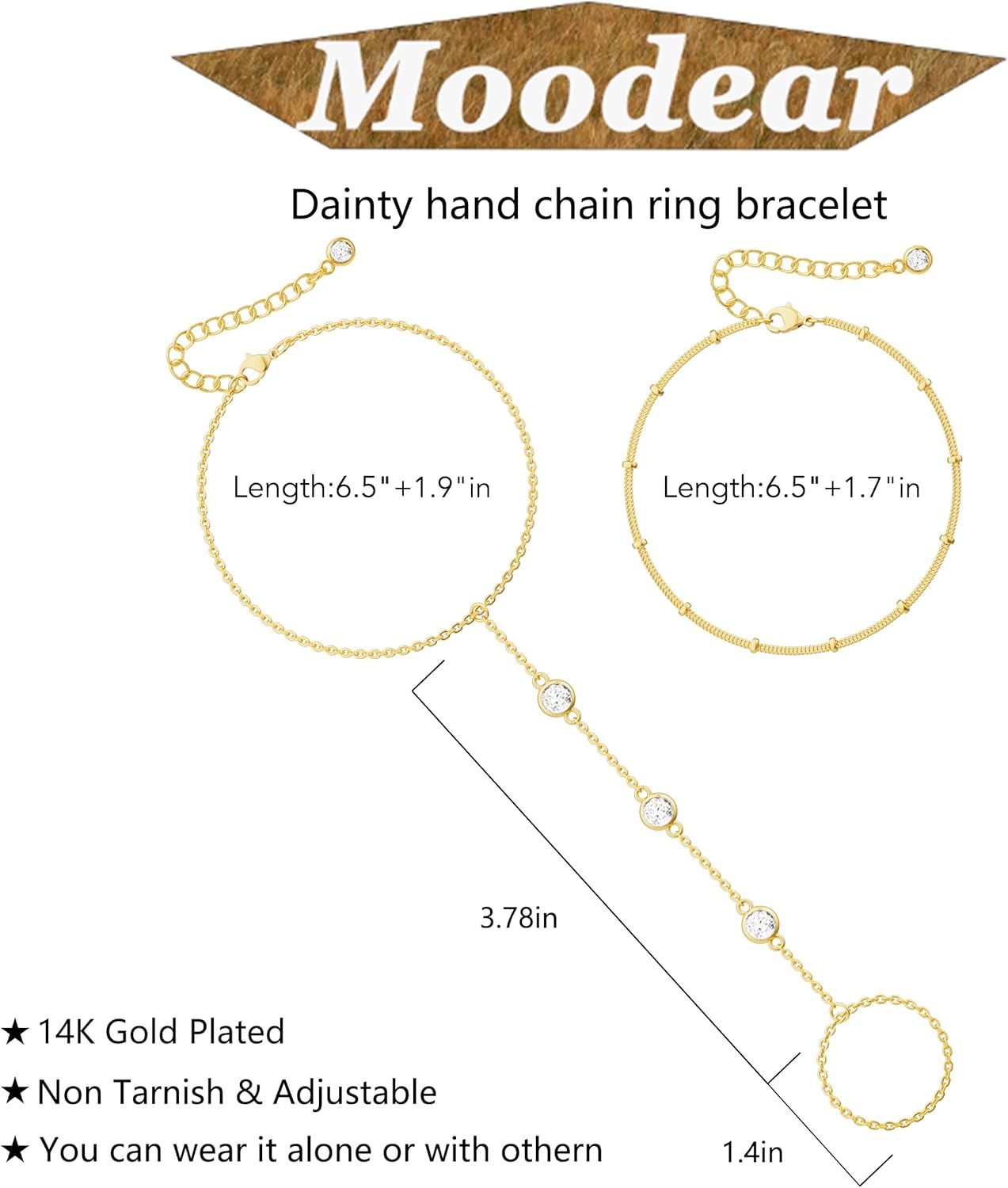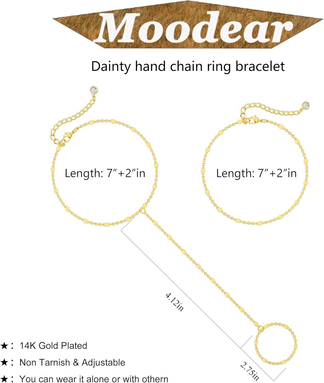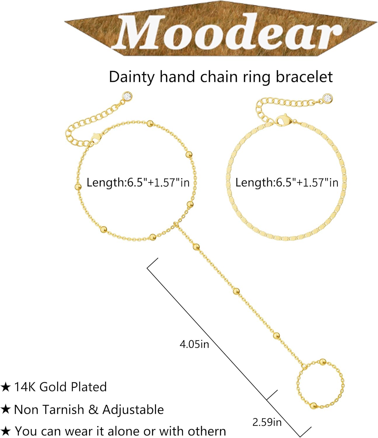 - 🎀Longueur Ajustable : La longueur du bracelet chaîne de main en or est de 6,5 "; la longueur du bracelet bague est de 3,9 "; nous avons également conçu une extension de 1,5" sur la chaîne ; vous pouvez ajuster la longueur adaptée pour le porter