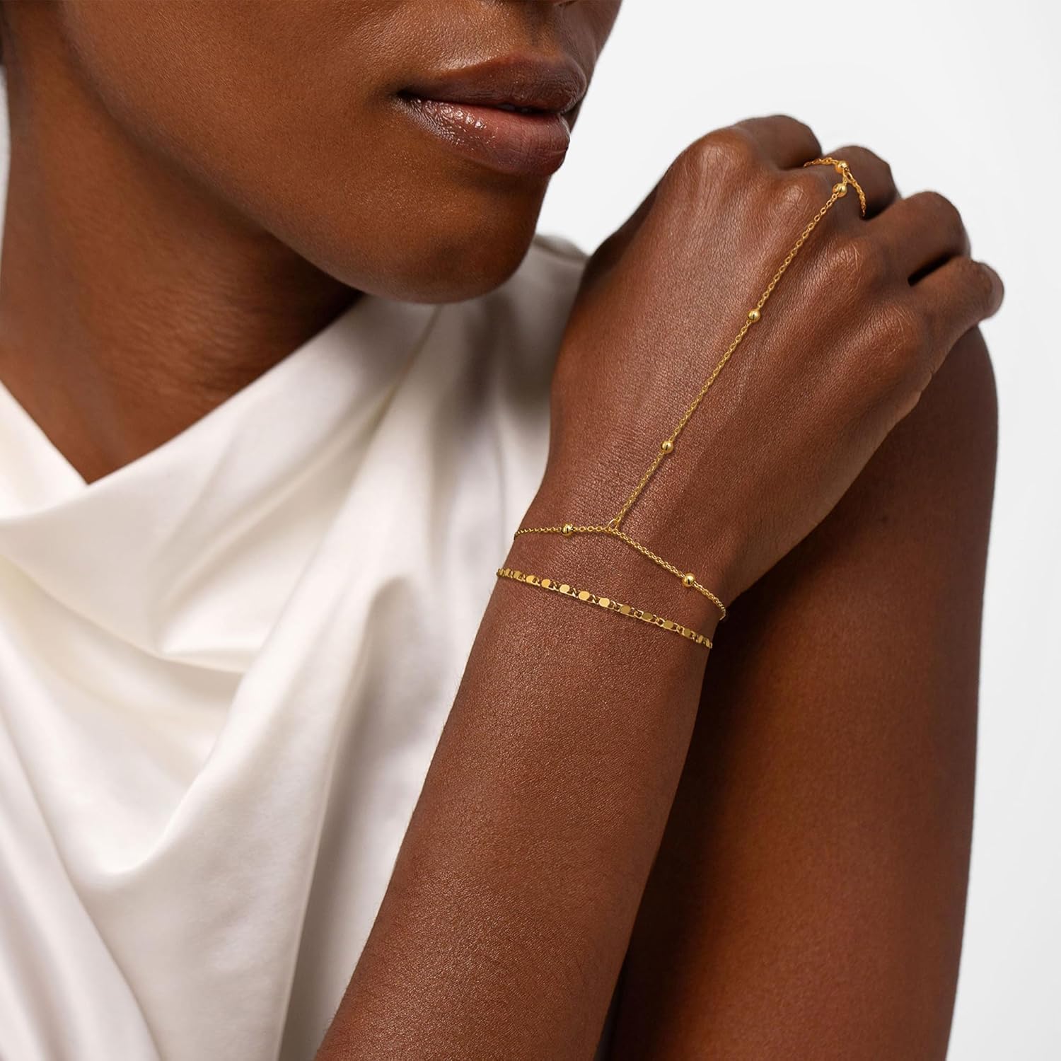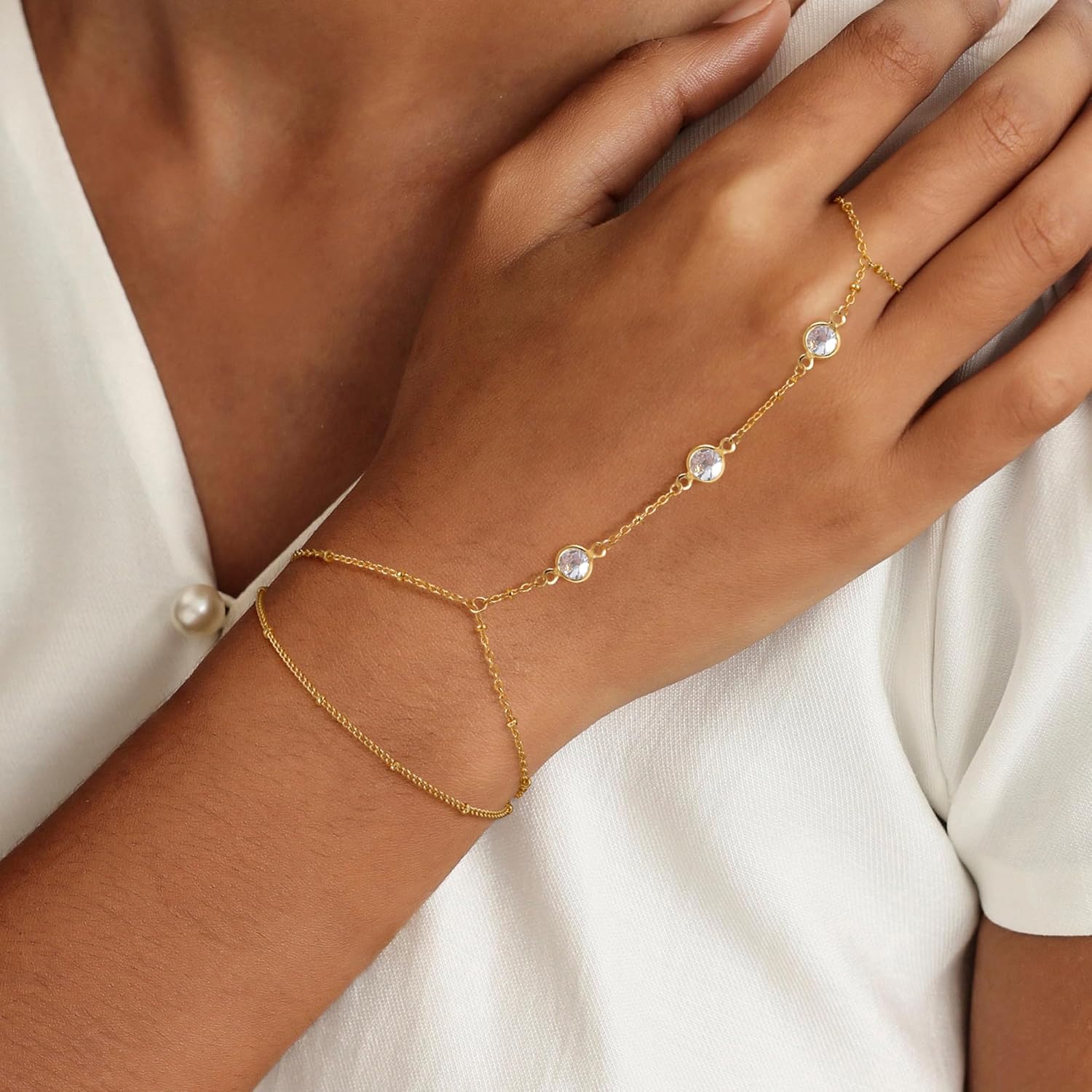 Bracelet bague délicat Moodear chaîne de main pour femmes - plaqué or 14K/argent sterling superposé réglable perle satellite chaîne trombone point CZ lien bracelets chaîne de main bijoux tendance cadeau ne ternit pas