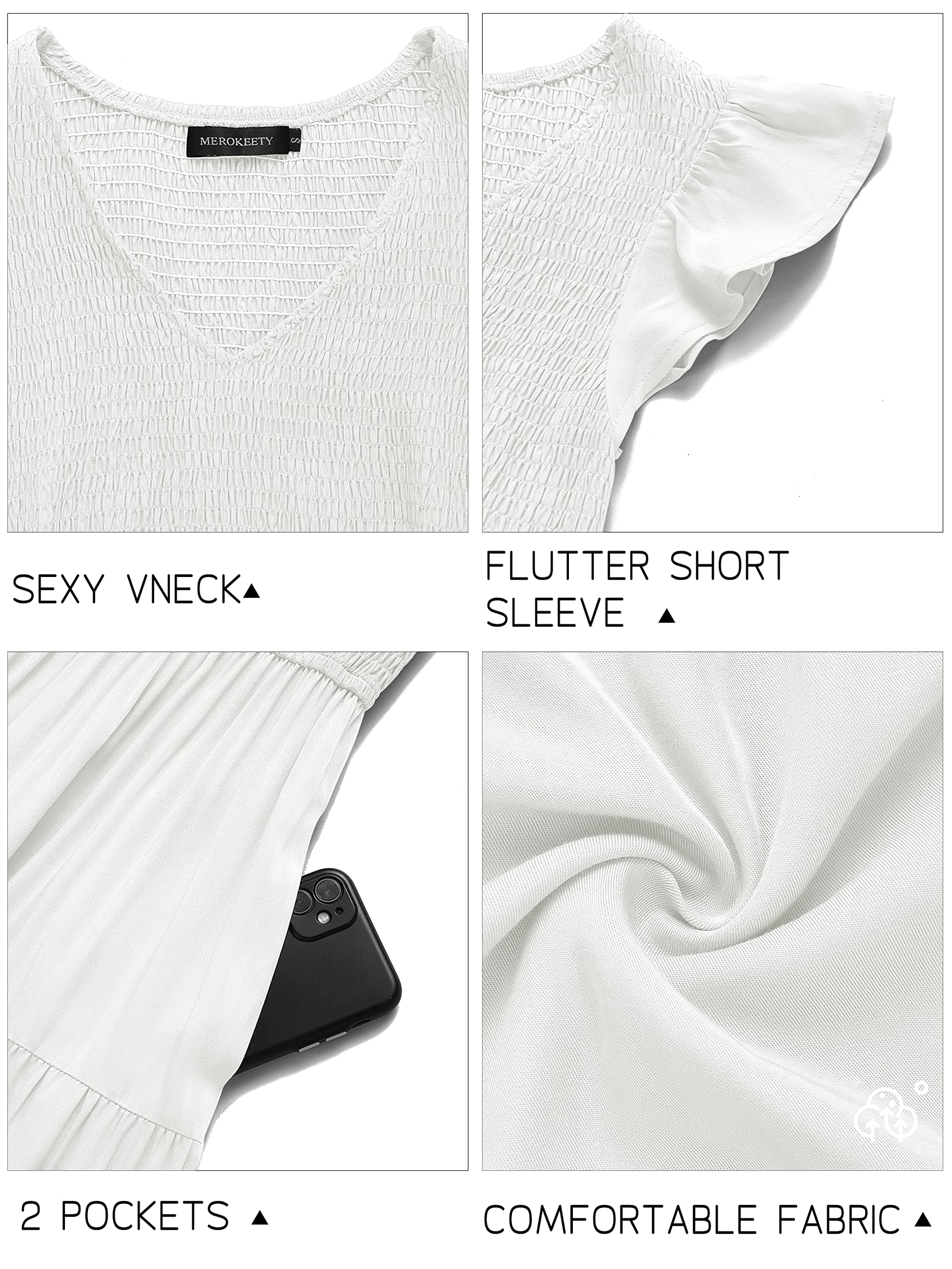 MEROKEETY Women's 2024 Summer Smocked V Neck Tiered Swing Long Midi Dress with Pockets, White, L