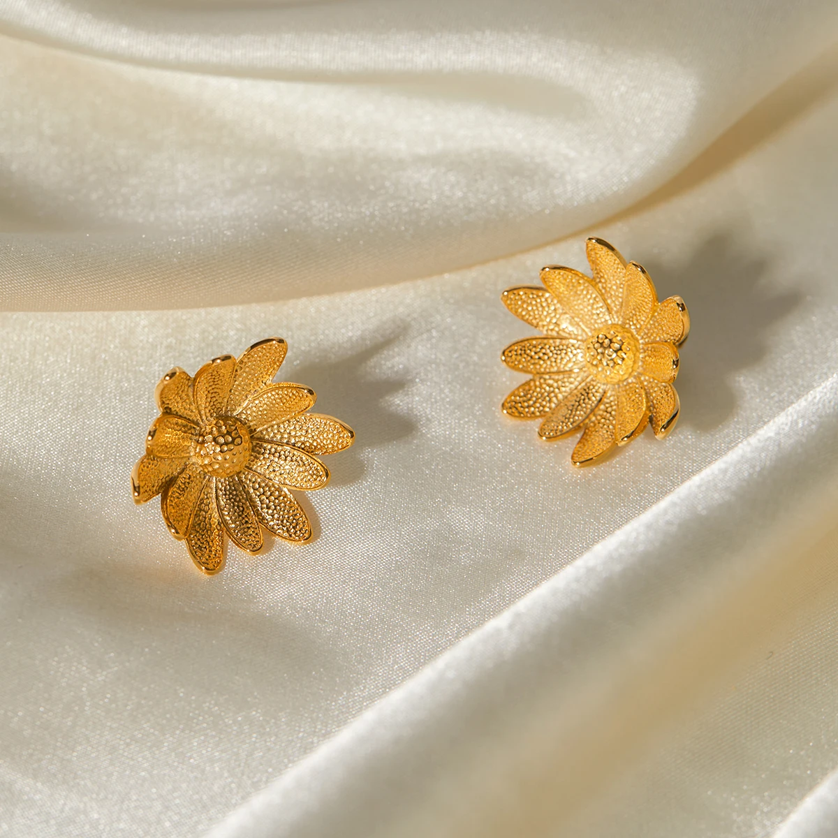 Orecchini da donna in acciaio inossidabile placcati oro 18k con design unico di piccoli fiori di margherita stilizzati in metallo testurizzato, gioielli per le vacanze