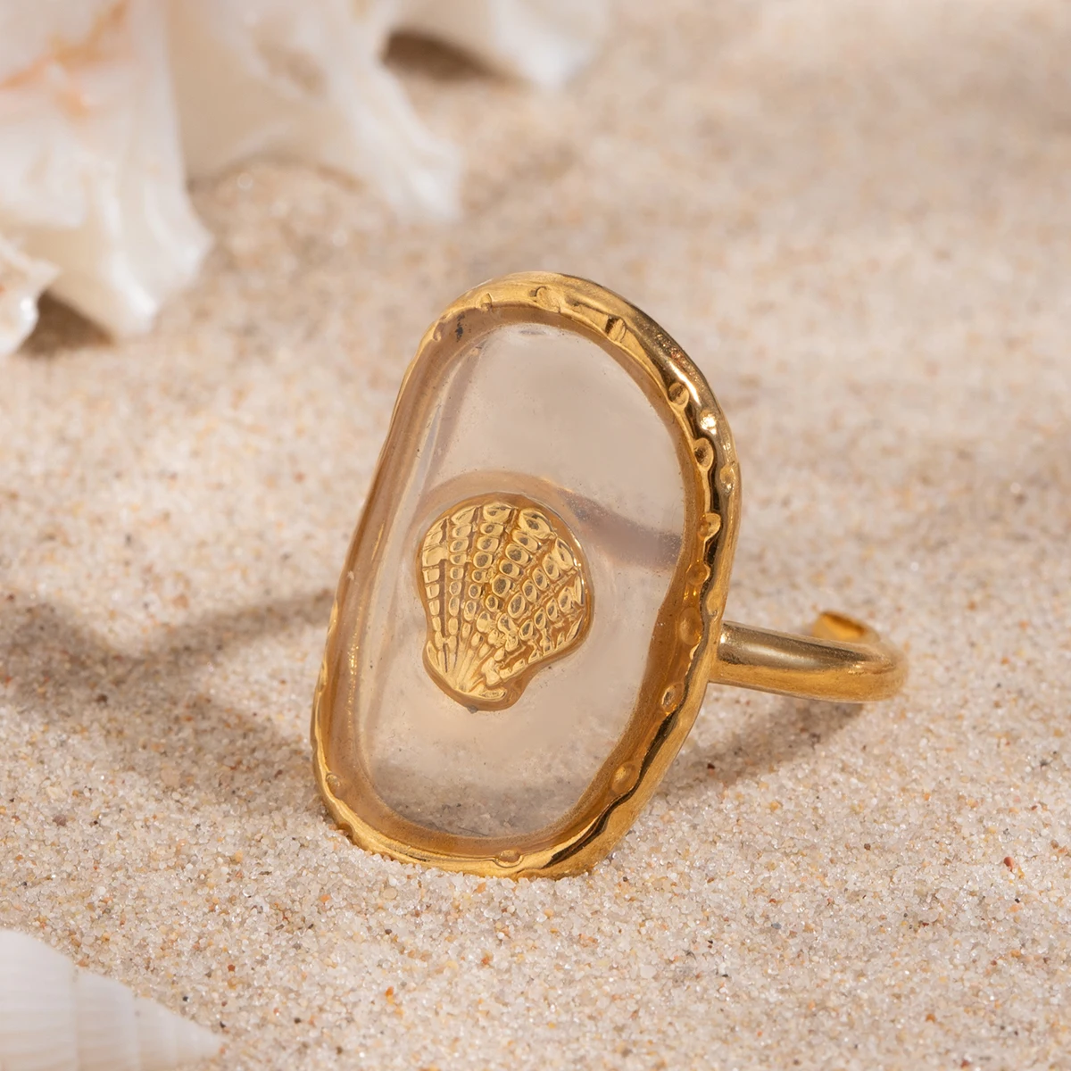 Anello aperto a martello con conchiglia a forma ovale in acciaio inossidabile placcato oro 18K, donna, antiallergico, charm, gioielli quotidiani, bijoux