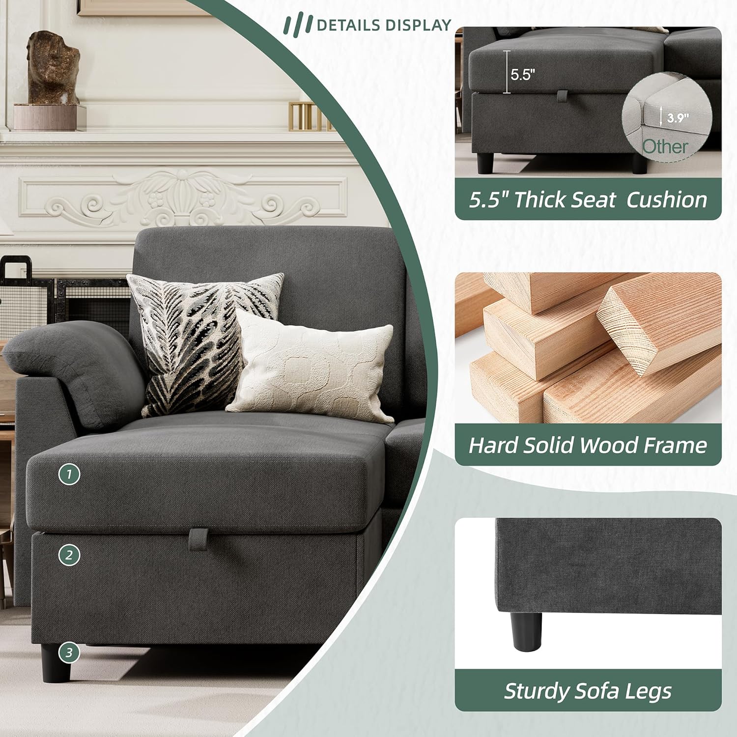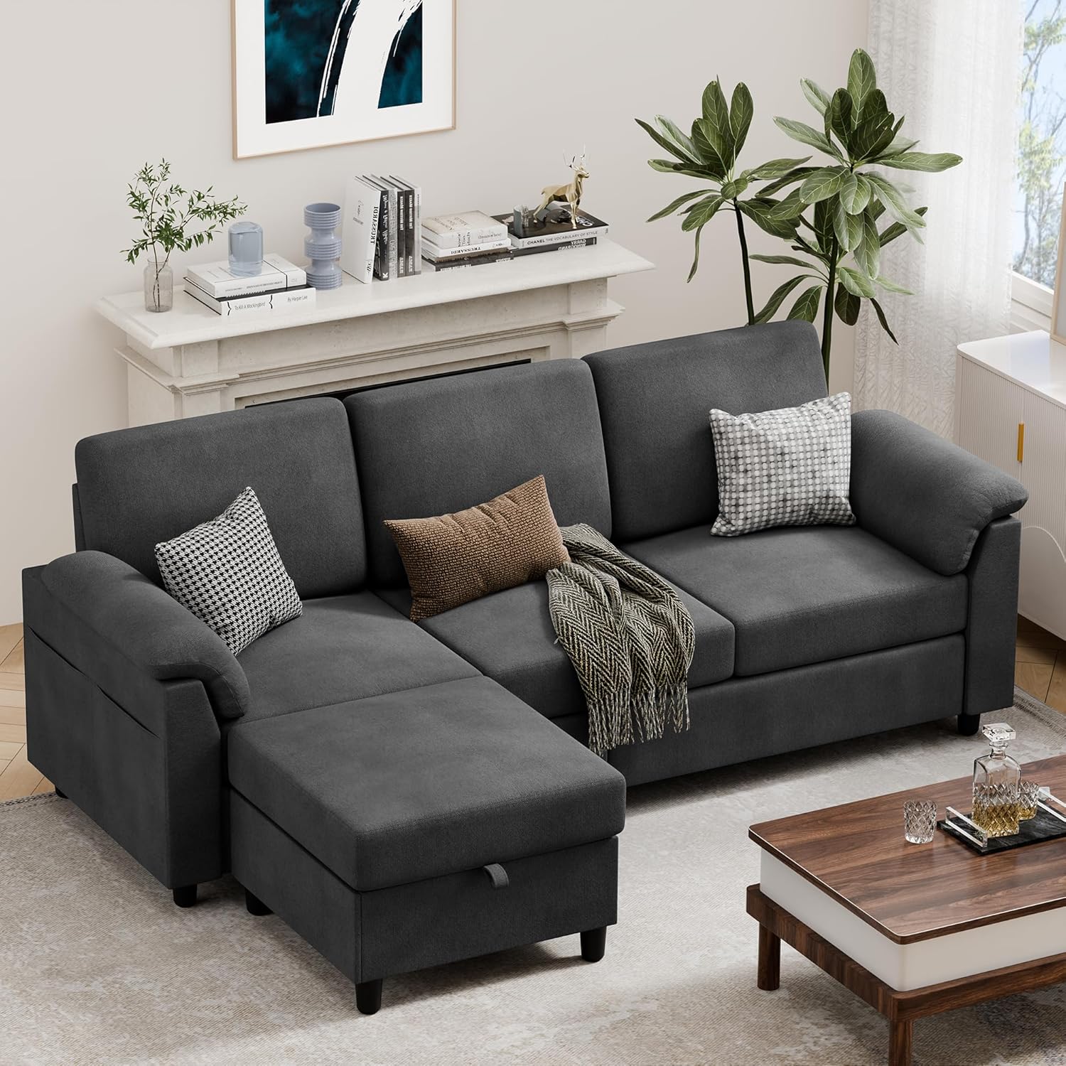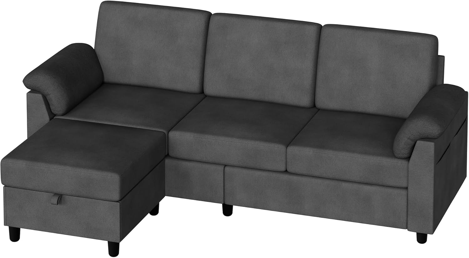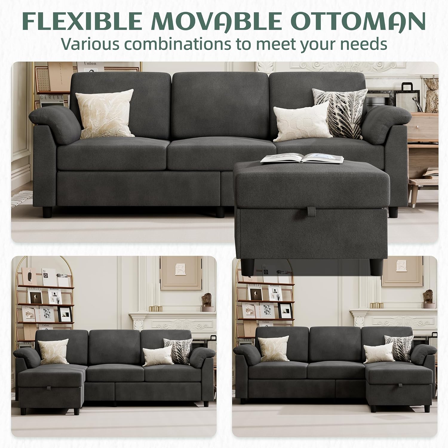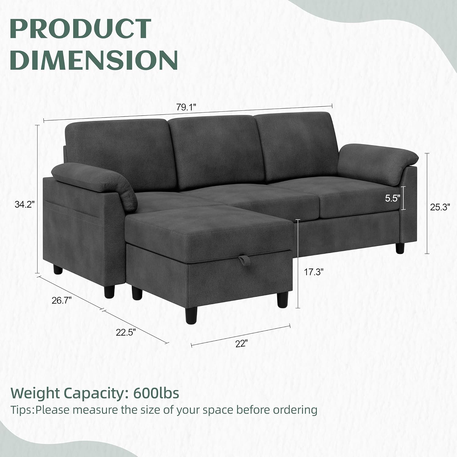 Vongrasig 79" Convertible Sectional Couch Sofa with Storage Ottoman, 3 Seat L Shaped Couch with Side Storage Pockage, Linen Fabric Small Couches for Living Room, Apartment and Small Space, Black