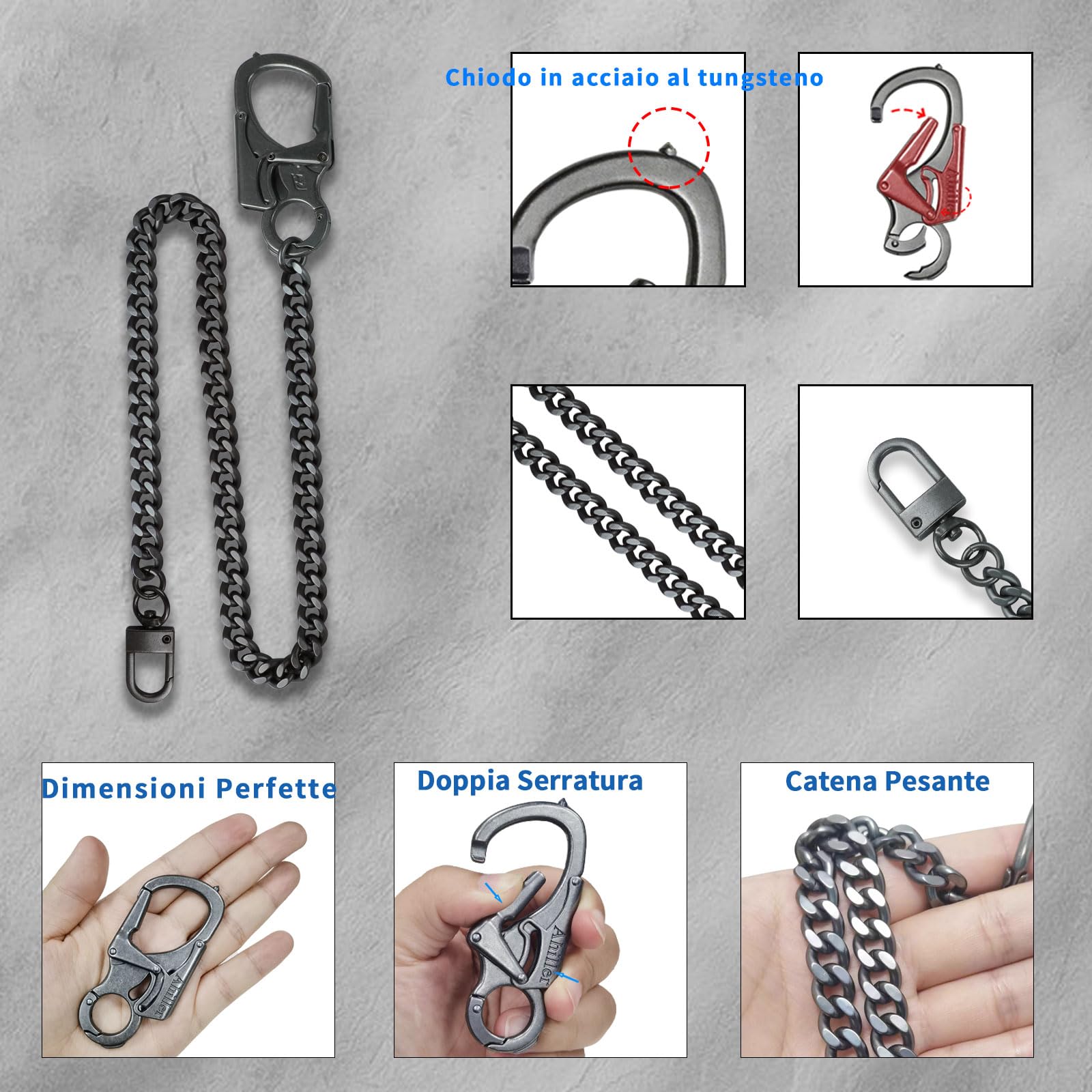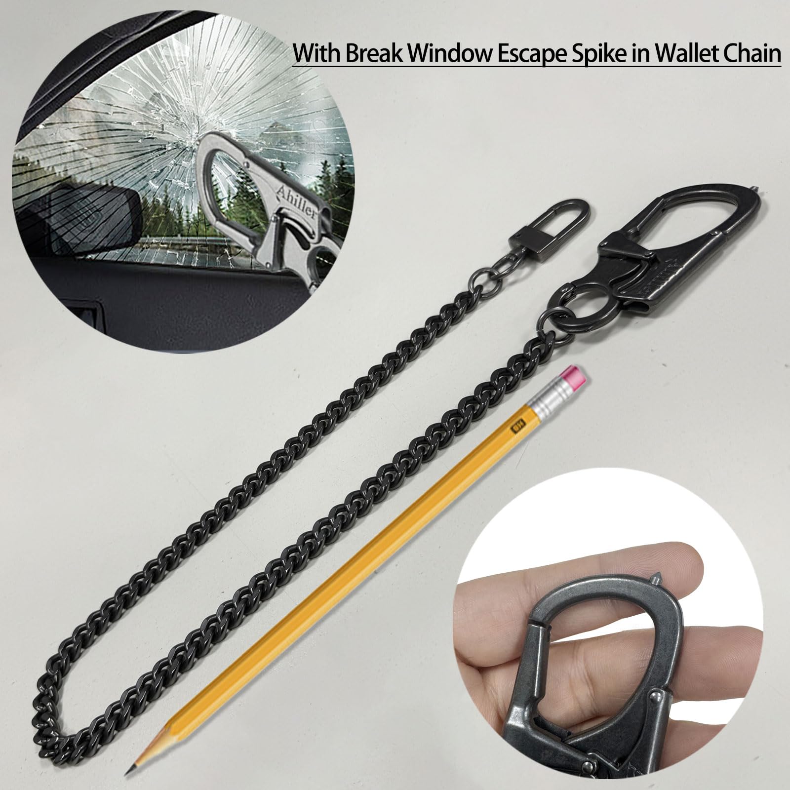 - CAR WINDOW BREAKER: The carabiner can be removed from the wallet chain and used separately. The spikes on the carabiner are made of tungsten steel spikes, which are hard and strong enough to easily break a one-story car window. This feature allows you to use it to escape in dangerous situations