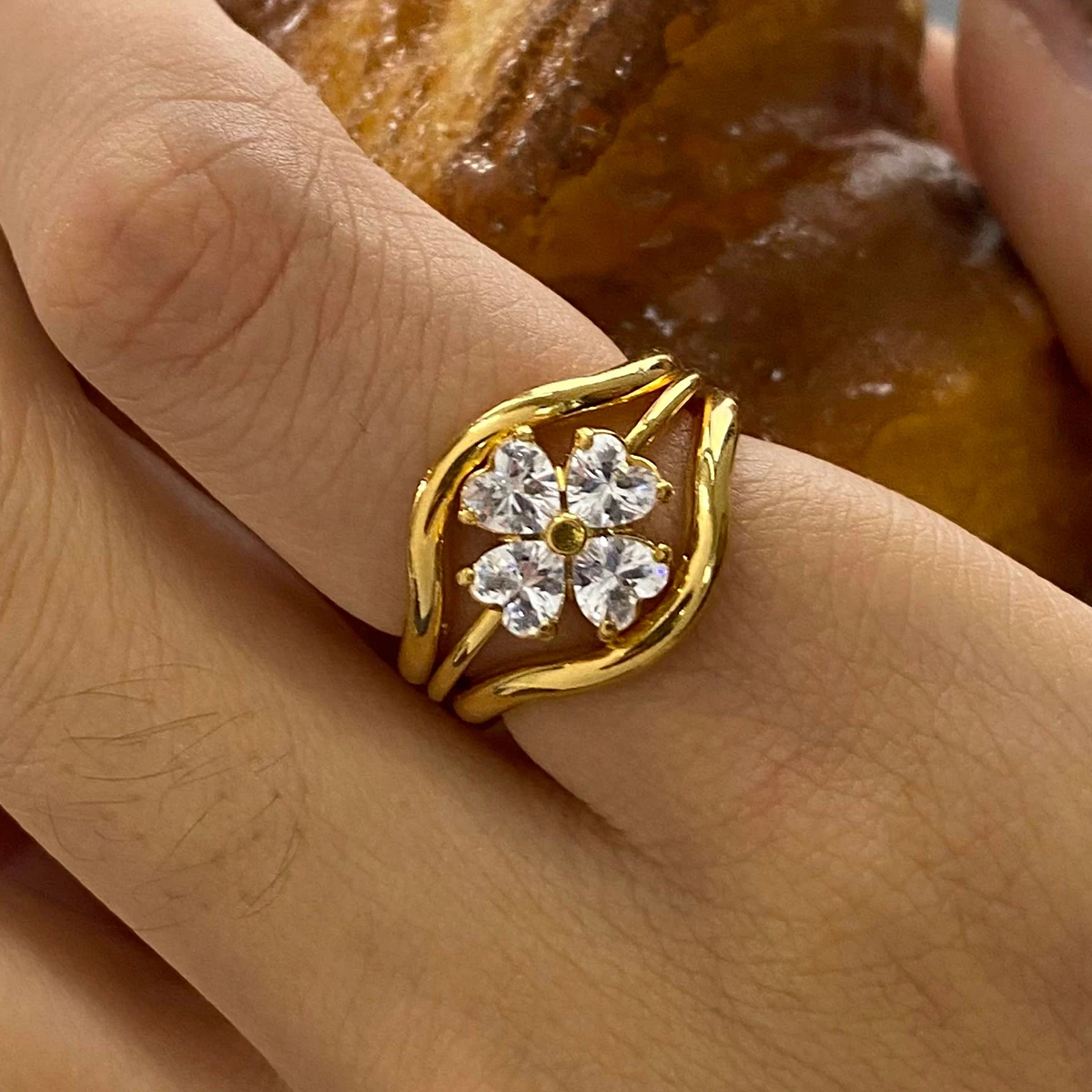 3個セット レディース エレガント 18K ゴールドメッキ ステンレススチール 重ね付け可能リング、ハート型ラインストーンとクローバーの装飾付き