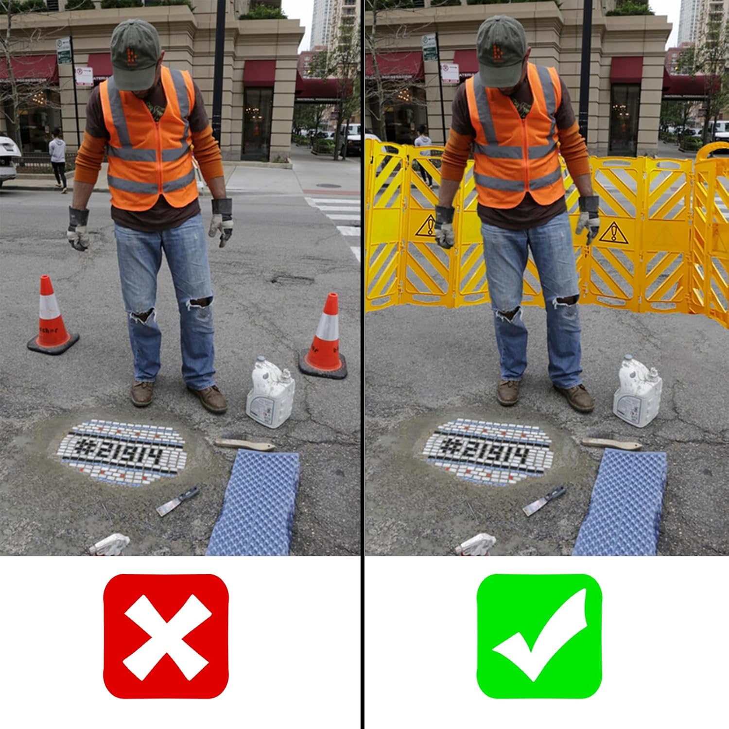 - Installation: The safety barrier can be easily set up in only seconds with folding design and wheels. The barrier can be set in straight, curved, in a circle.