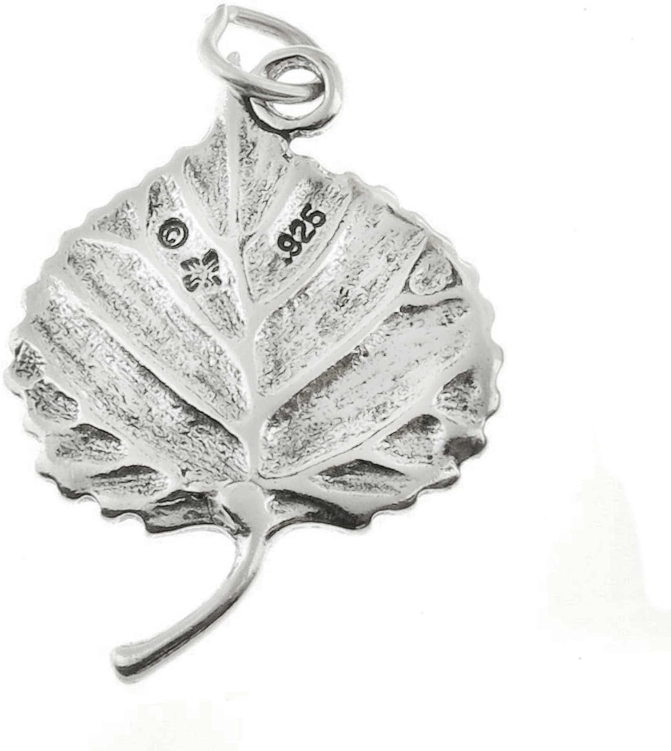Aspen leaf .925 solid sterling silver charm or pendant. The charm is hallmarked, comes with a 6mm sterling silver keychain/split ring, and can fit a traditional charm bracelet or a chain necklace.
