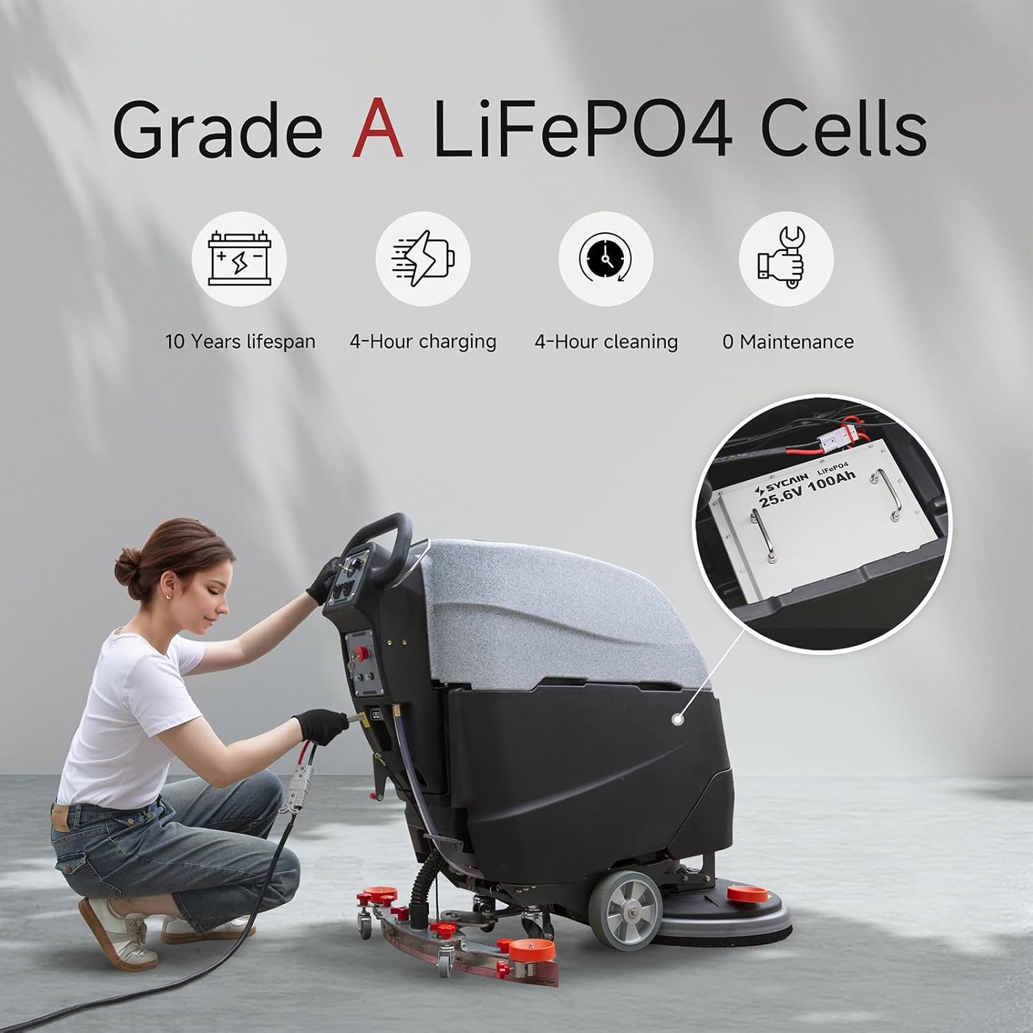 - EFFICIENT AND DURABLE CLEANING: The A-grade lithium battery in the commercial floor scrubber is light and mobile. With a total runtime increase of 30%, you can use it in the morning, charge during lunch, and continue cleaning in the afternoon, providing 4 hours of cleaning with just a 4-hour charge. This optimizes cleaning schedules and improves efficiency. The ten-year maintenance-free battery life reduces long-term costs by eliminating the need for battery replacements