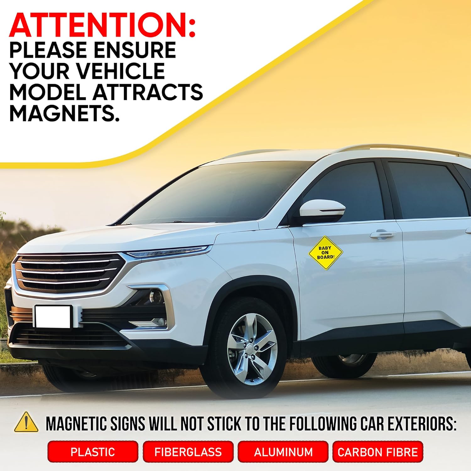 - ⭐ EASE OF USE AND LOW MAINTENANCE: Firstly, clean down the area where the baby on board sign will be applied ensuring it is free from dust and dirt. Apply the magnet firmly and evenly ensuring there is no air pockets between it and the car surface.