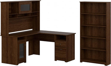 ブッシュファニチャー キャボット 60W L字型コンピューターデスク ハッチ付き 5段棚付きブックケース エスプレッソオーク