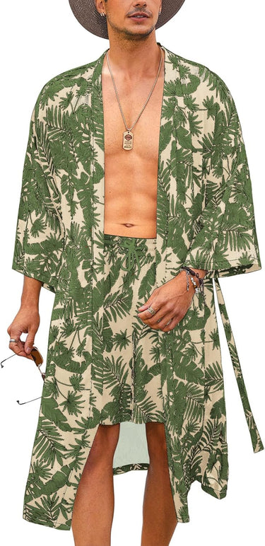 COOFANDY Men Lightweight 2 Piece Kimono Robe with Shorts Japanese Robes Casual Open Front Long Cardigan With Belt