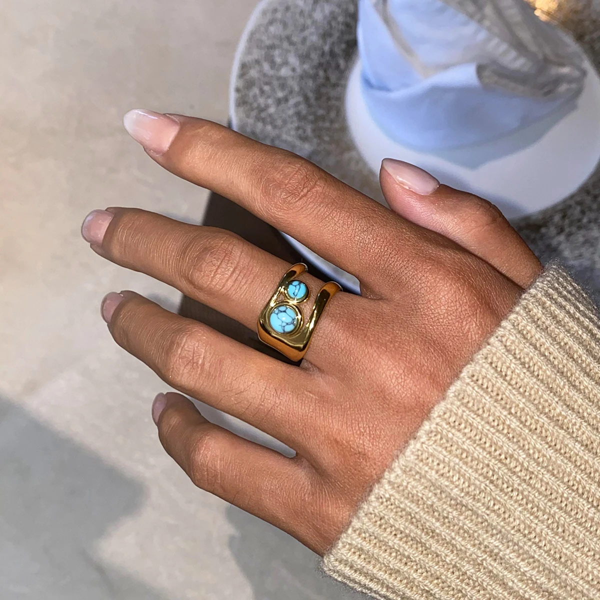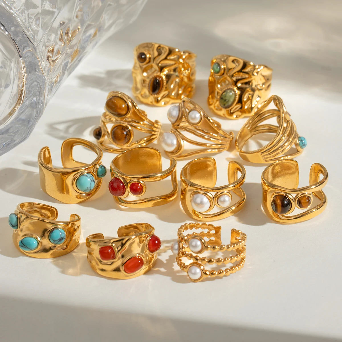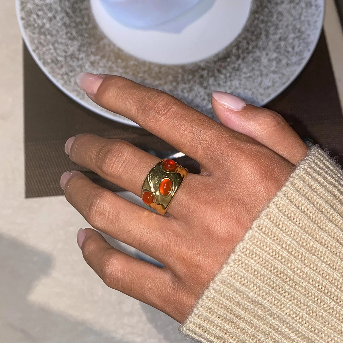 クリエイティブ 18K ゴールドメッキ ステンレススチール 幾何学的 ラウンド スムーズオープニング リング インレイ アゲート レディース アンチアレルギー トレンディ ジュエリー