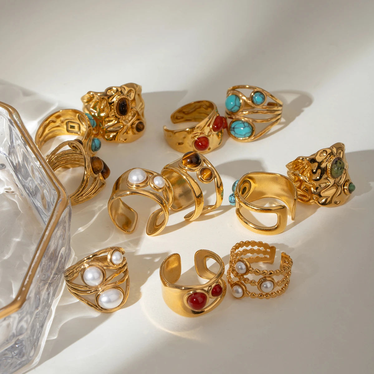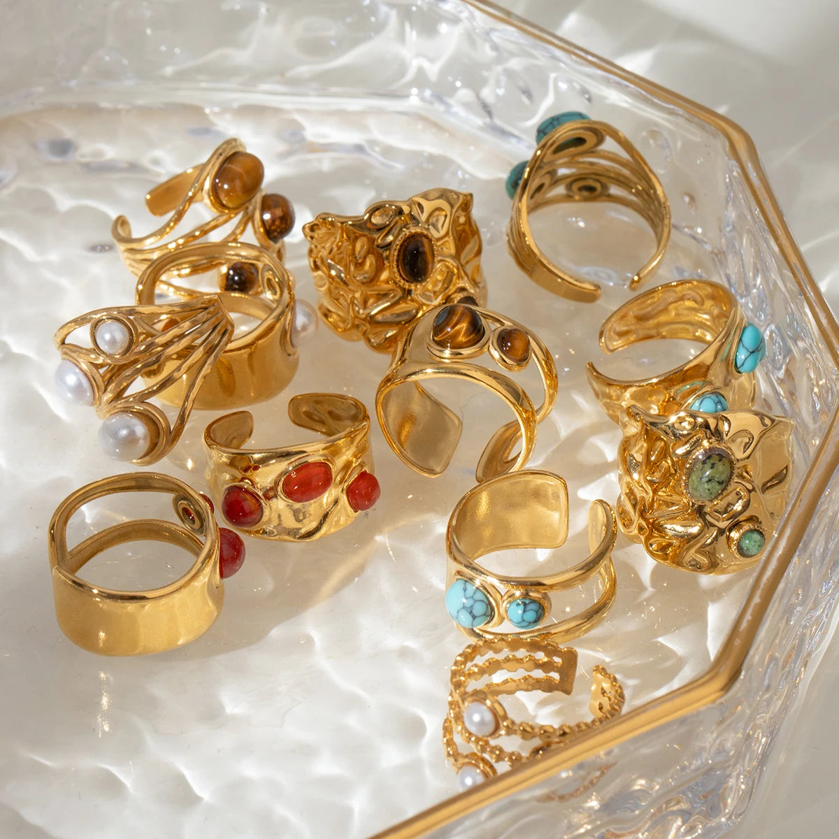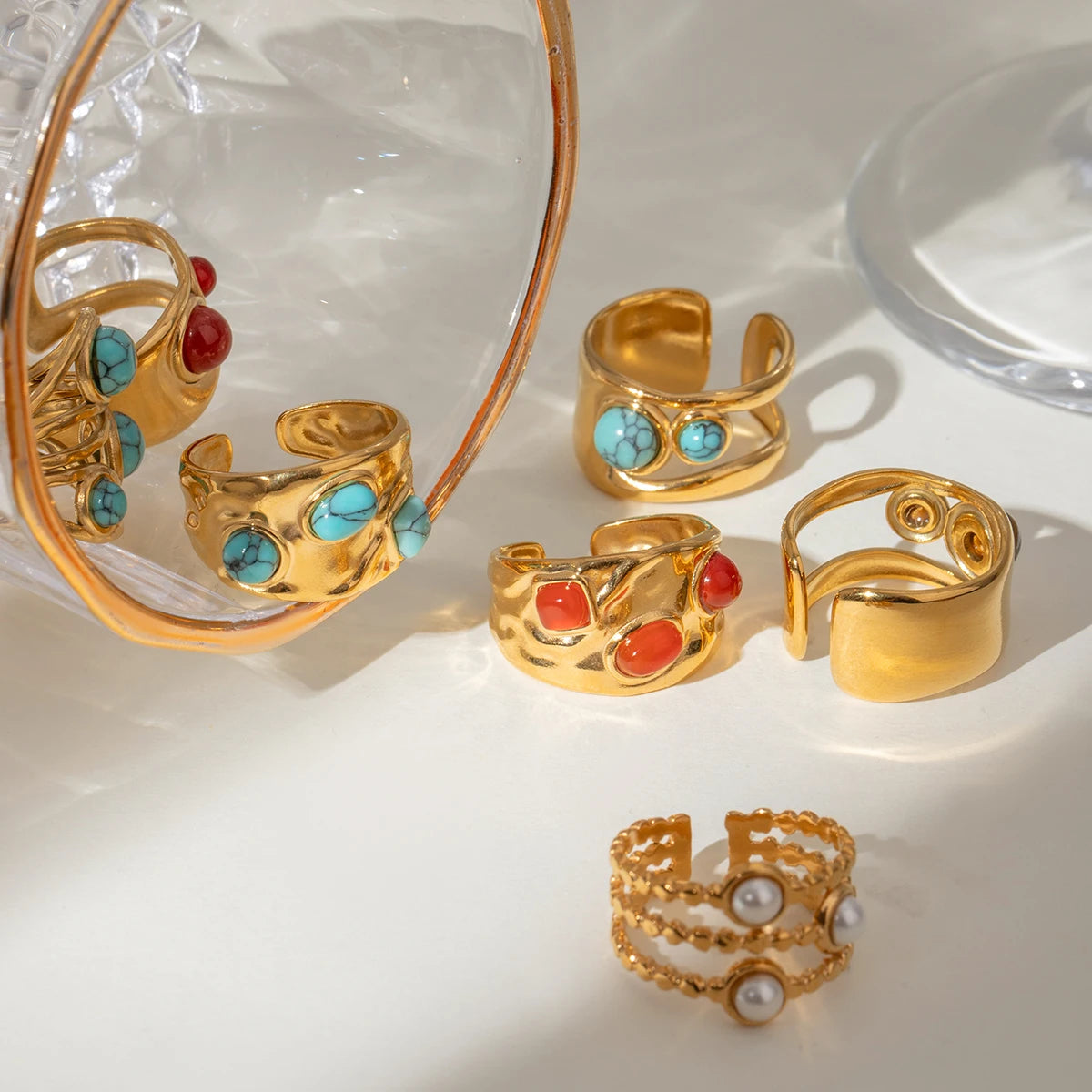 クリエイティブ 18K ゴールドメッキ ステンレススチール 幾何学的 ラウンド スムーズオープニング リング インレイ アゲート レディース アンチアレルギー トレンディ ジュエリー