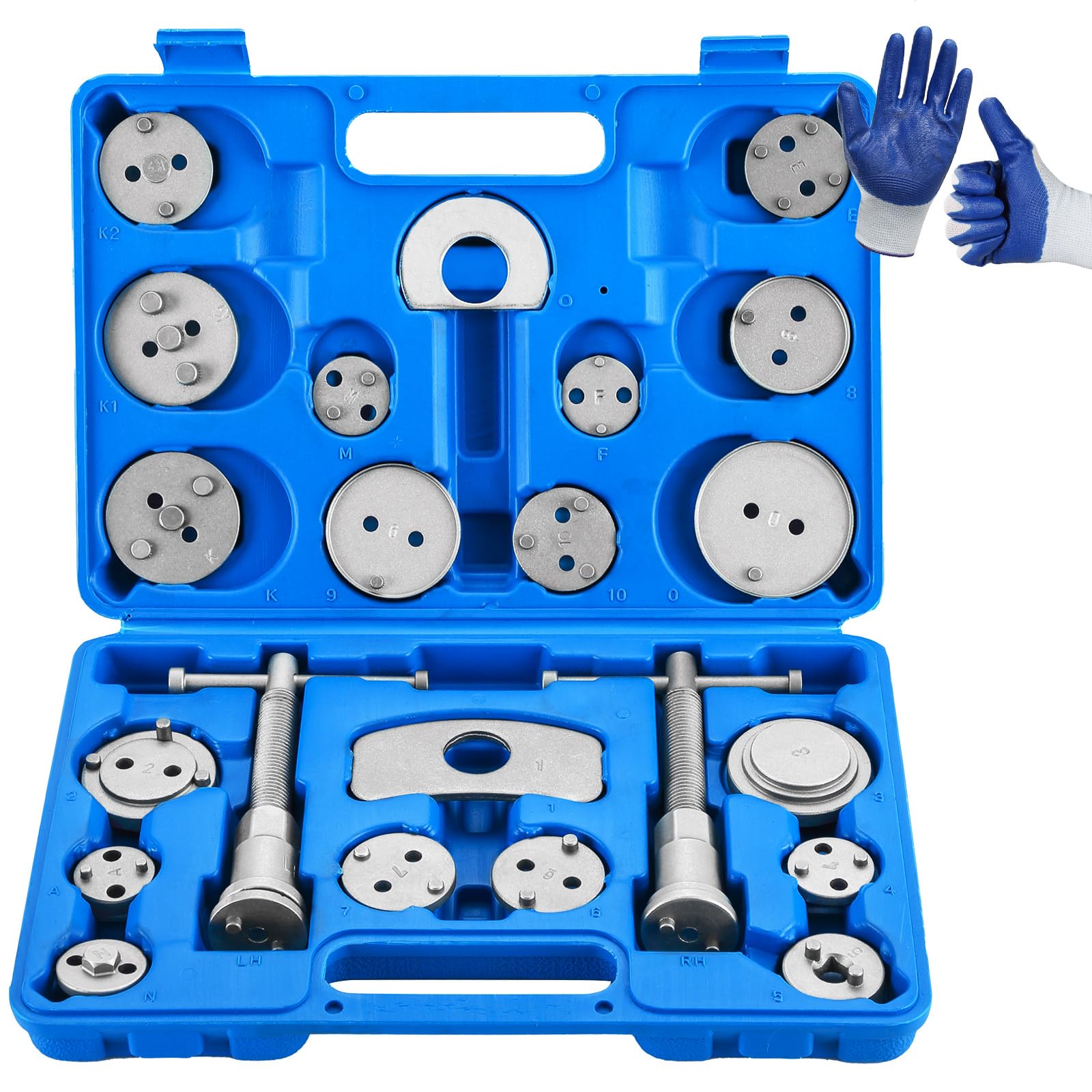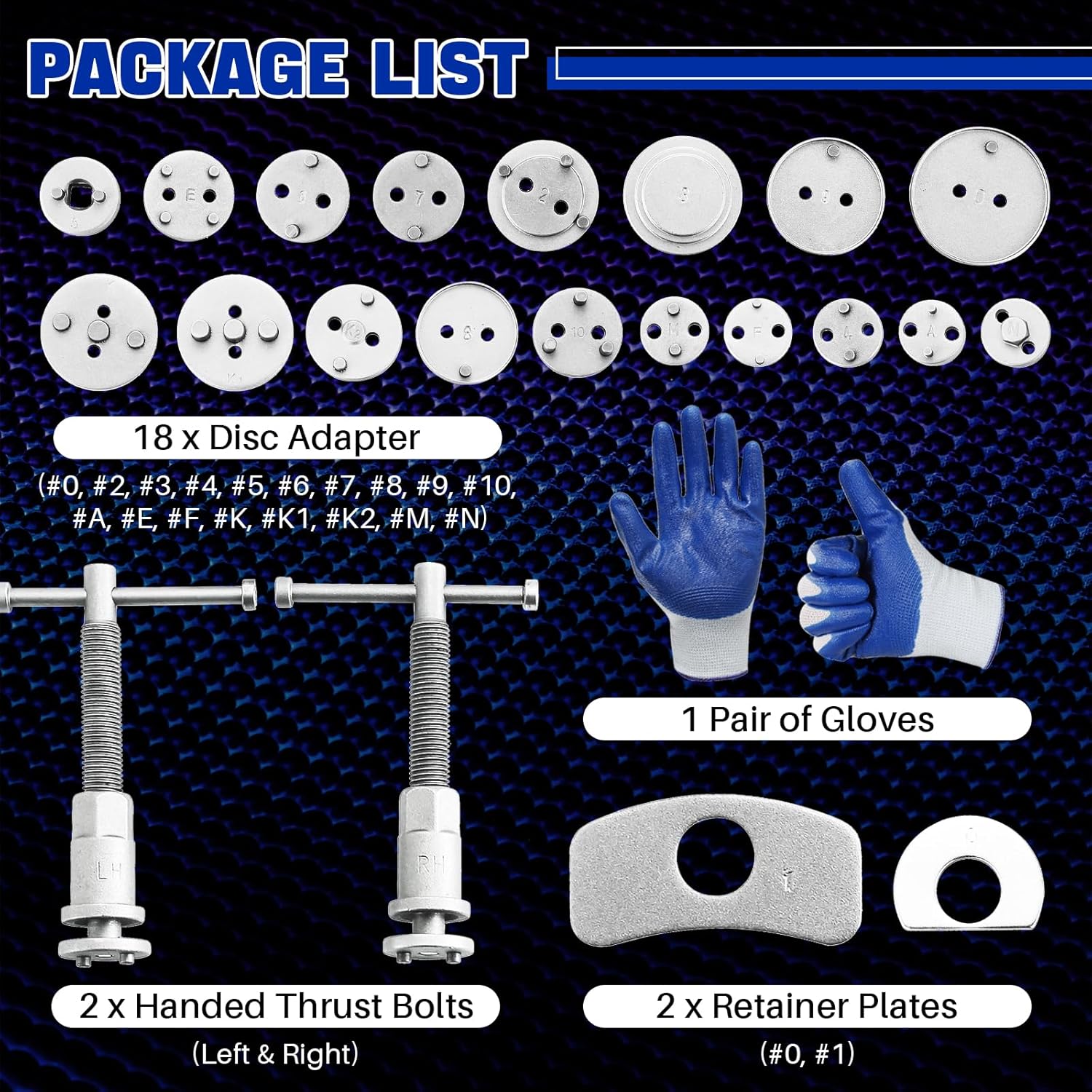 - Package List: The 24pcs universal disc brake caliper piston compressor set includes 18 x Disc Adapters; 2 x Retainer Plates; 1 x Right Hand Thrust Bolt; 1 x Left Hand Thrust Bolt; 2 x Work Gloves; 1 x Carry Case.