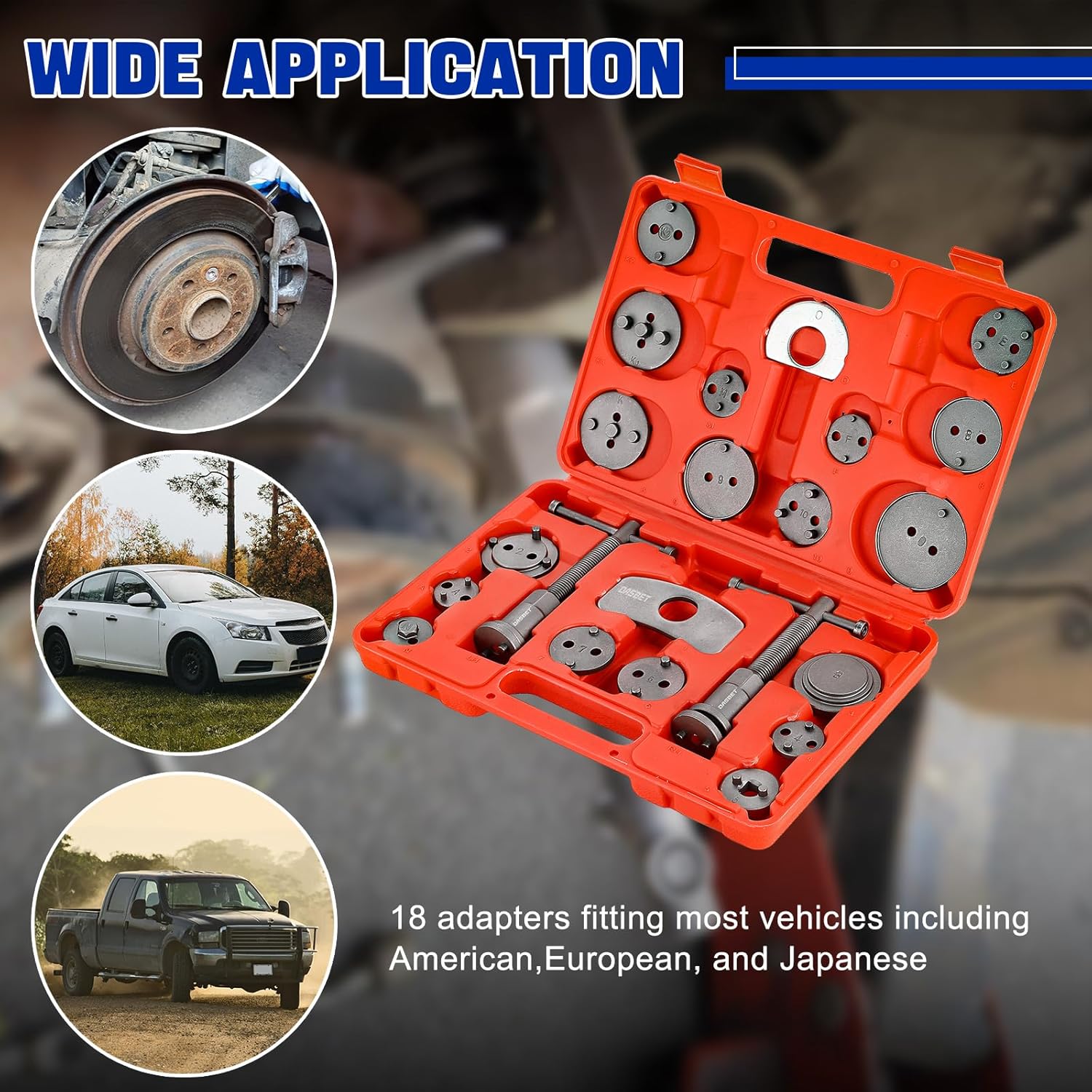 - Wide Compatibility: The brake caliper compression tool set is equipped with 18 adapters. The disc brake caliper tool kit fits most vehicles of domestic, European, Japanese etc.(NOT limited to specific brand & models as listed).