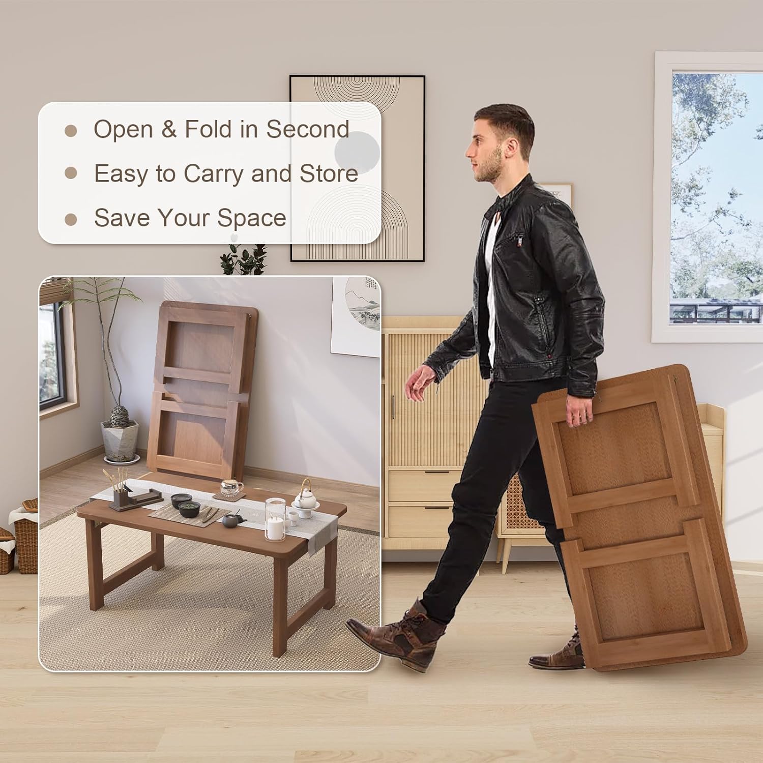 - No Assembly Required: No need to worry about complicated assembly. Our Japanese folding coffee table can be used by simply unfolding. The smooth surface material of the coffee table is easy to wipe, helping to maintain its clean appearance for years to come.