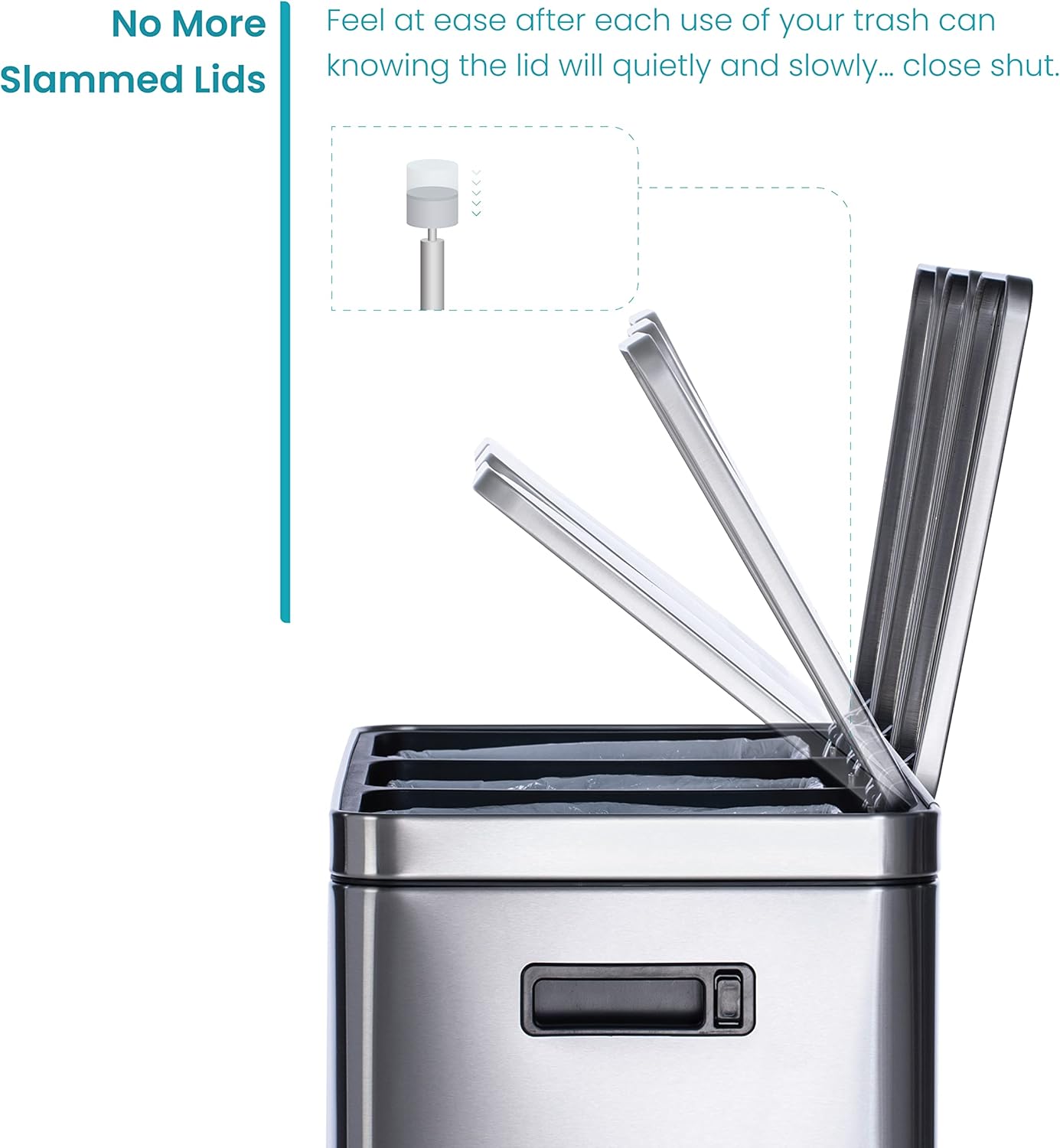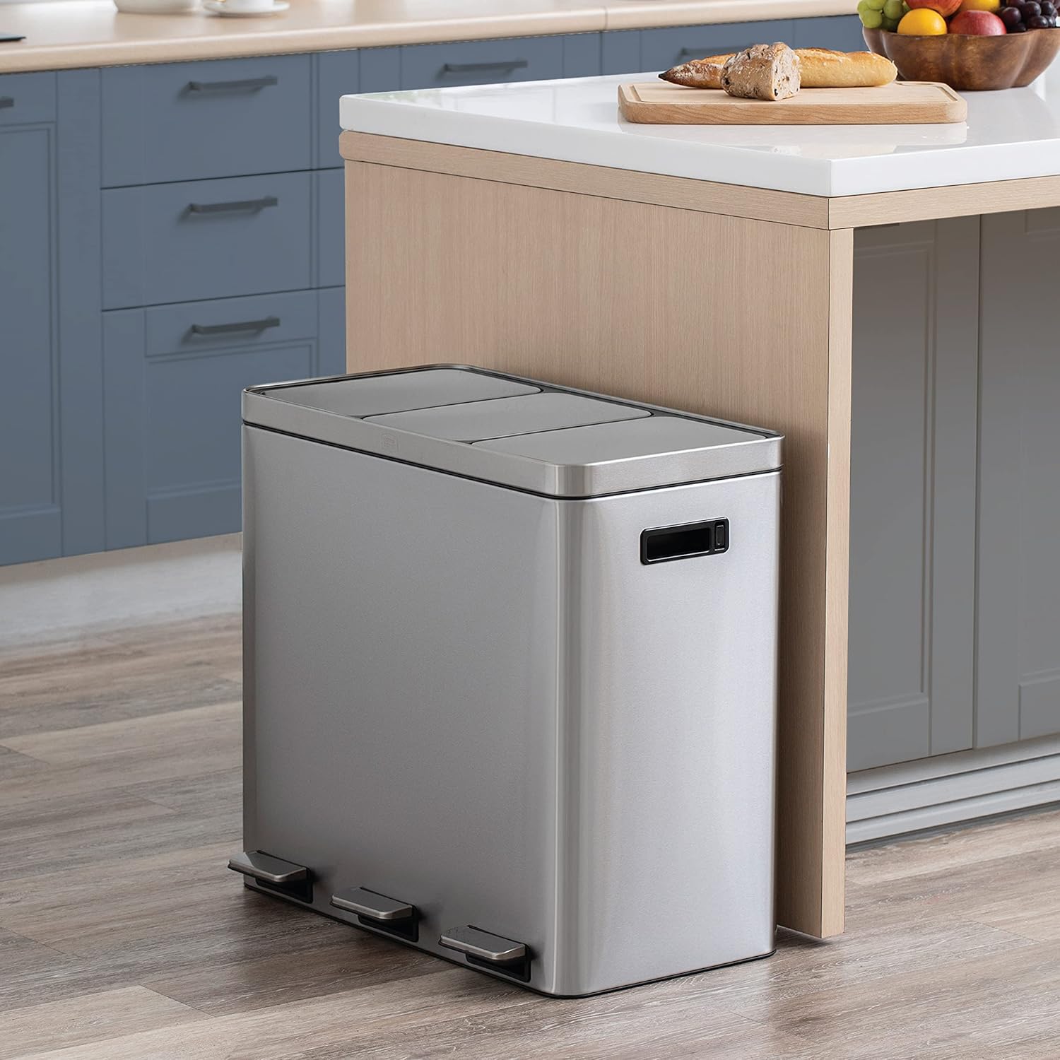Home Zone Living 16 Gallon Large Kitchen Trash Can with Three Compartments for Recycling, Stainless Steel, Silver, 60 Liters Total
