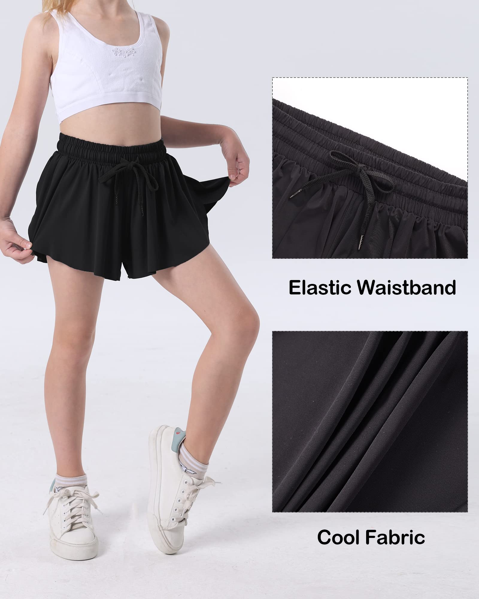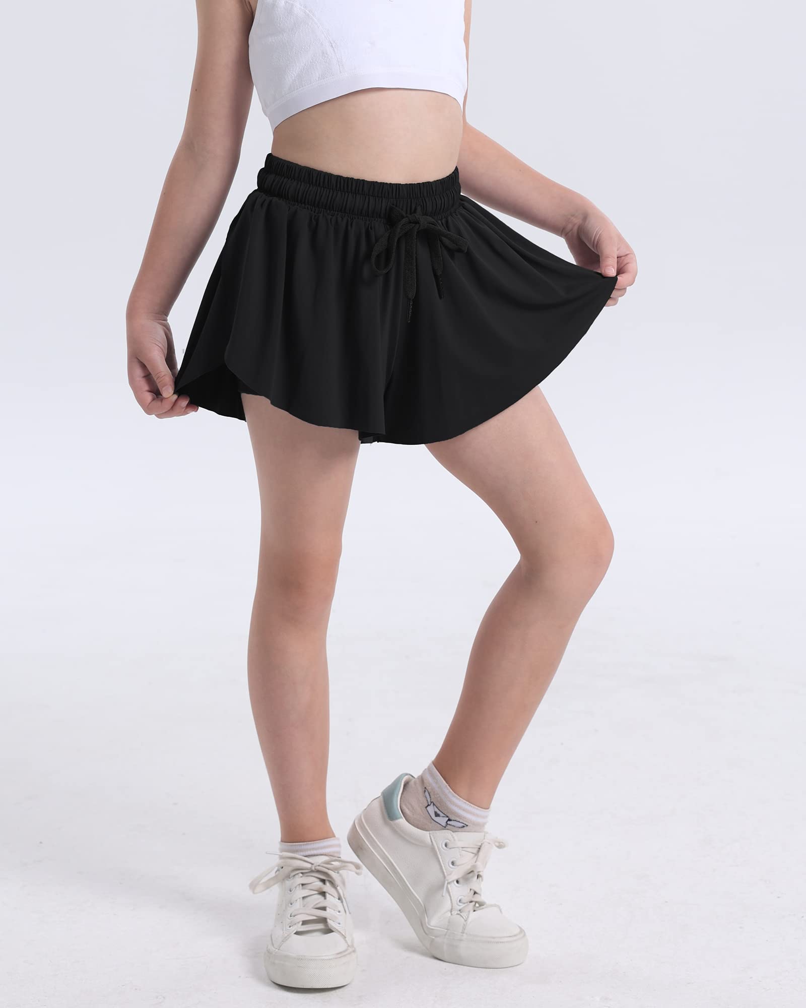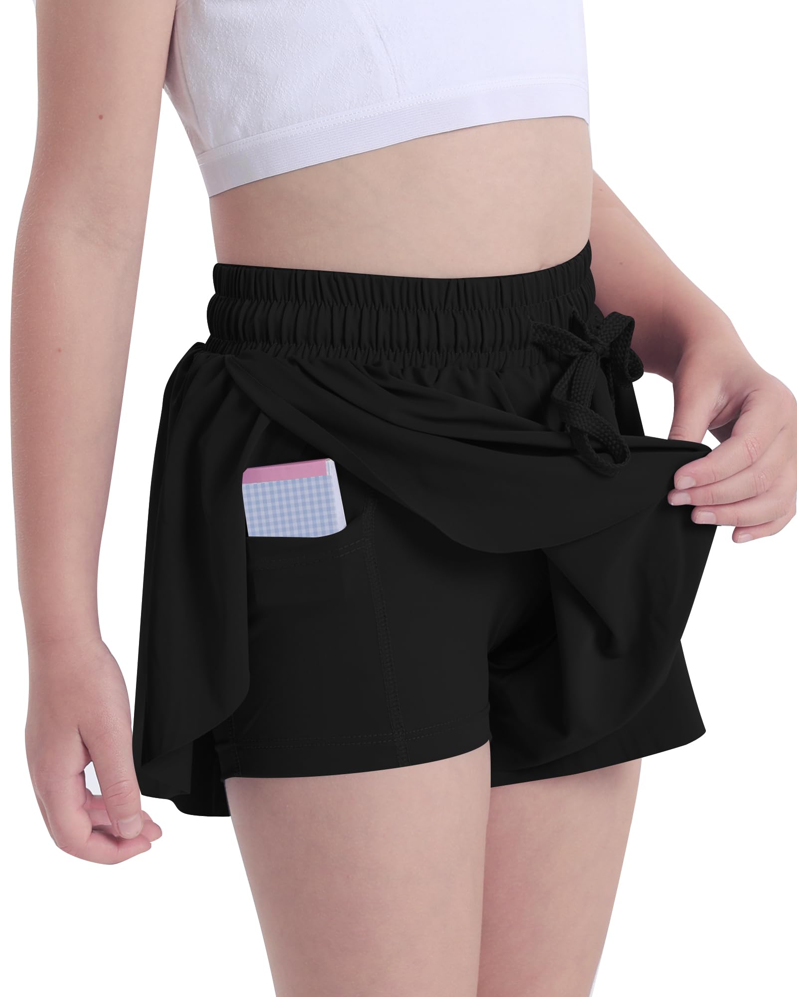 KEREDA Girls Flowy Shorts,Butterfly Shorts for Teen Girls with Spandex Liner 2-in-1 for Running,Gym,Athletic,Workout 1 Pack 9-10Y (Black)