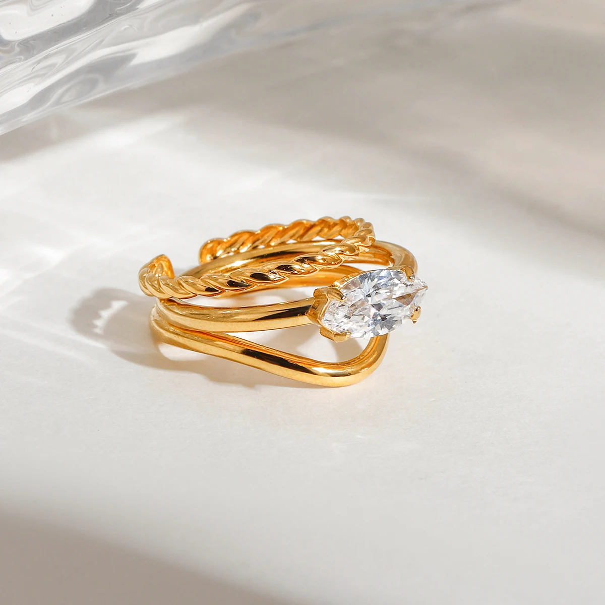 2個セット レディース 洗練された 18K ゴールドメッキ ステンレススチール 重ね付け可能 リング ラインストーン付き ダブルレイヤー 空洞ツイスト