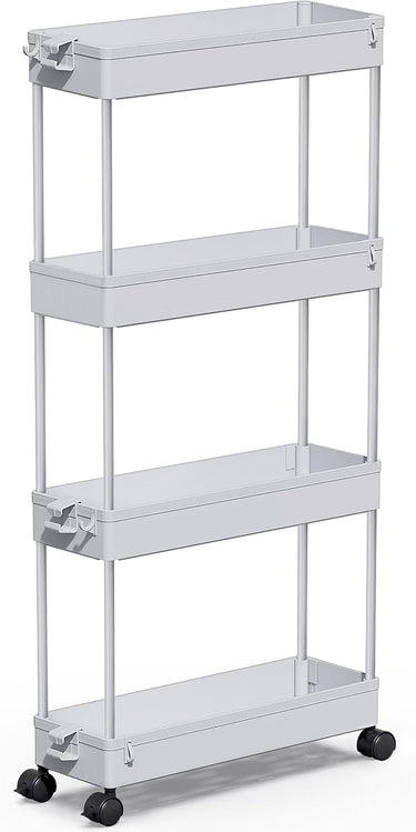【柔軟な4段収納カート】- 4段のスリム収納カートは4.75インチの設計で、家の狭いスペースでの収納に最適です。クローゼット、キッチン、バスルーム、ガレージ、ランドリールーム、オフィス、または洗濯機と乾燥機の間に適しています。