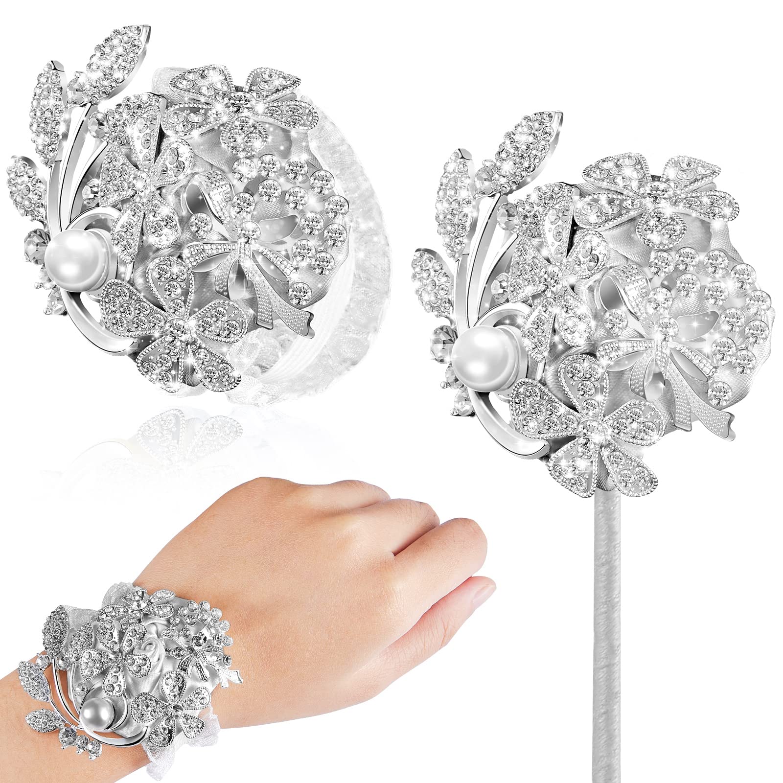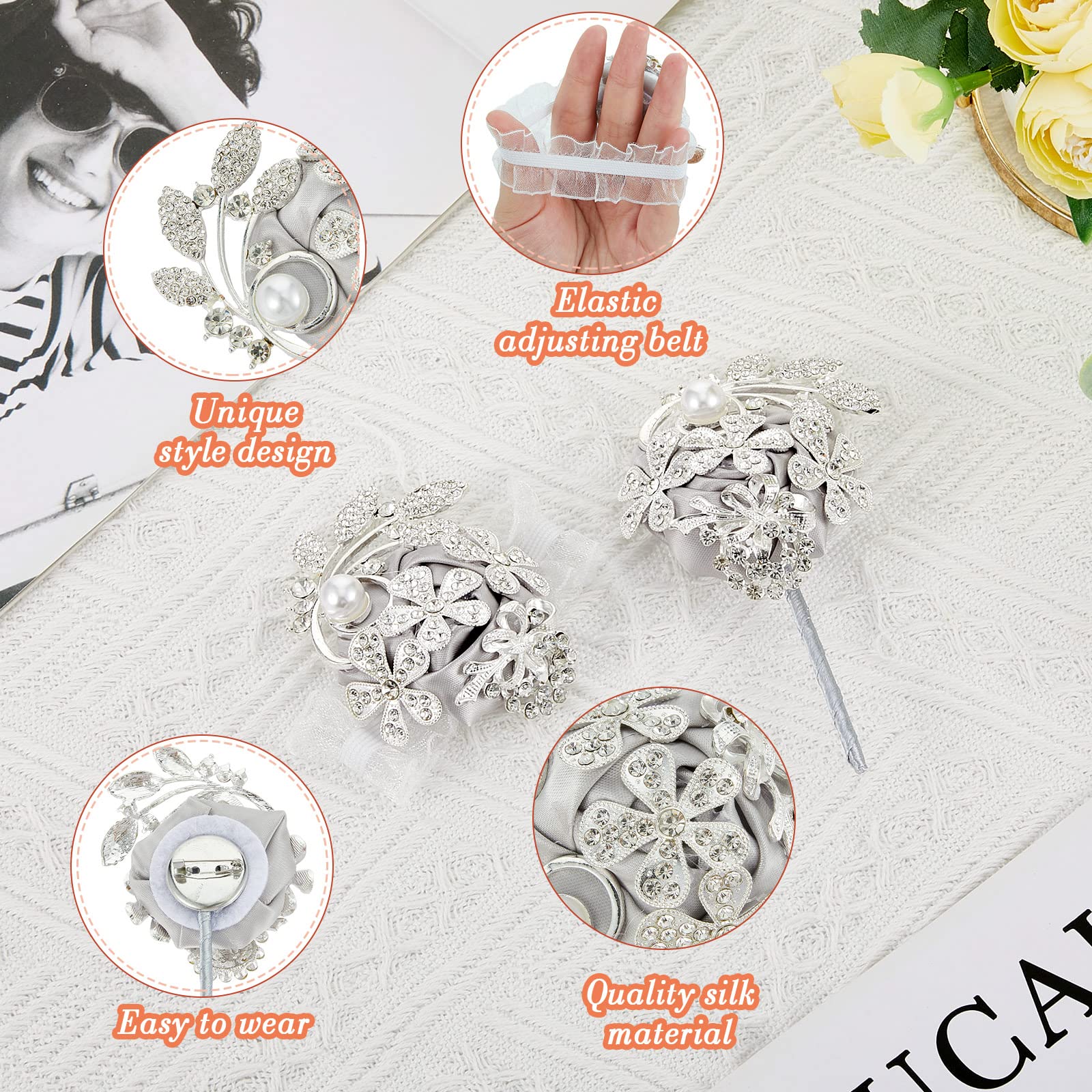 Yunsailing 2 Pcs Artificial Corsages Wrist Flower Rhinestone Wrist Corsage Artificial Silk Corsage Wedding Wrist Corsage for Wedding Boutonniere Wrist Flowers Party Bridal Shower (Silver Gray)