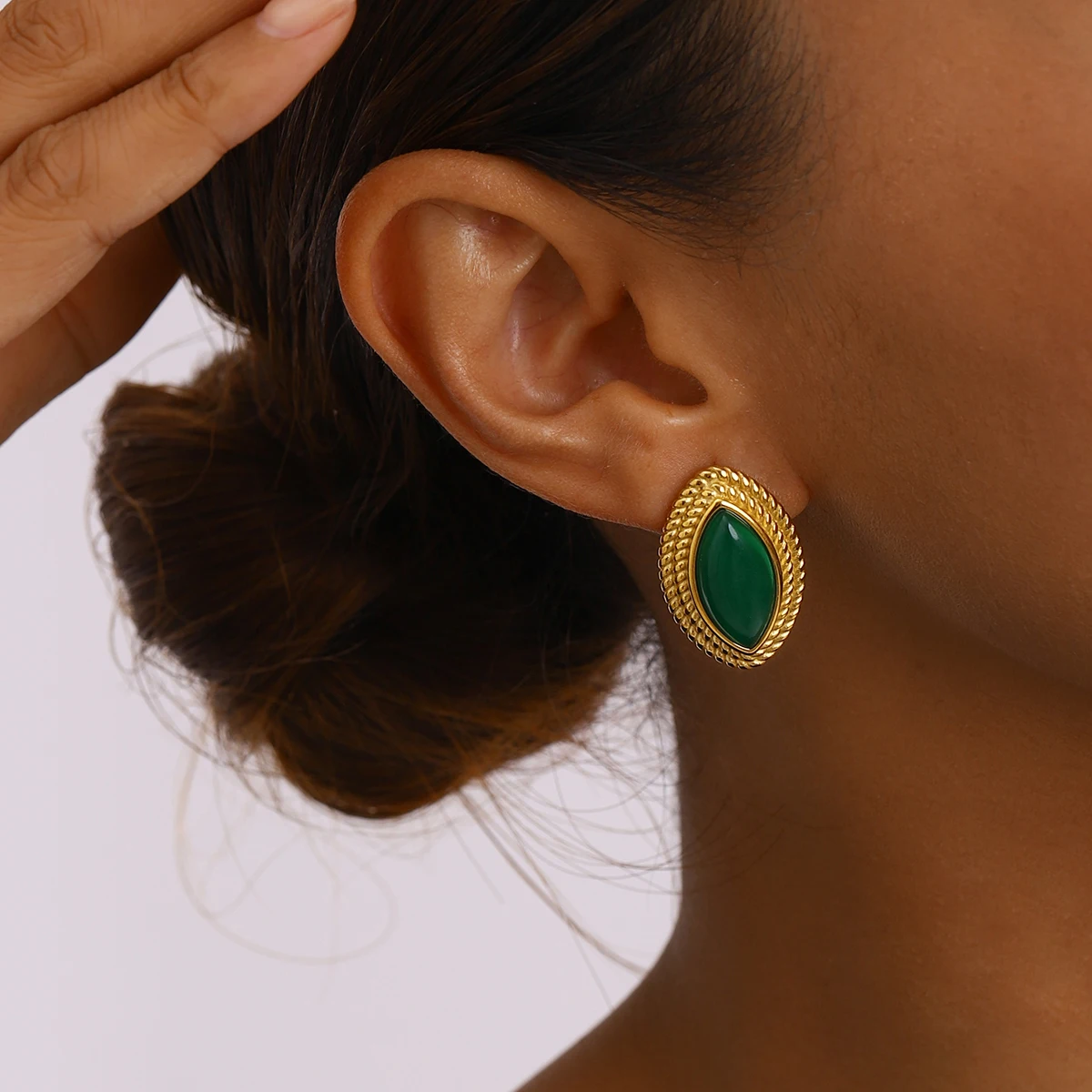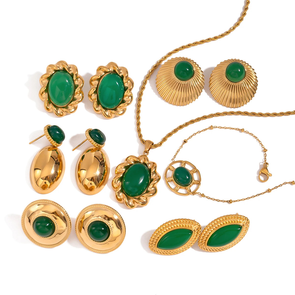 18k goud vergulde roestvrijstalen ingelegde natuurlijke steen groene agaat oorbellen ketting armband serie vrouw waterdichte sieraden